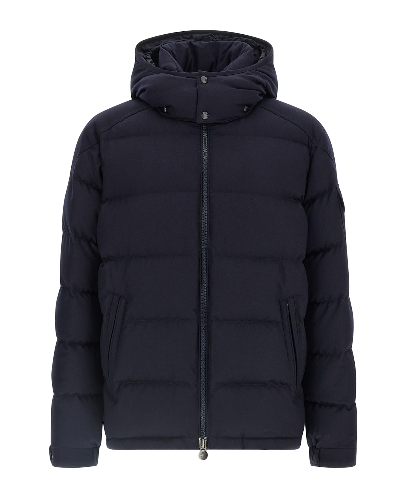 'Montgenevre' quilted wool flannel down jacket, léger nylon lining with goose down padding, adjustable and removable hood, standing collar, front zip closure, pockets, long cuffed sleeves and felt logo patch, drawstring at the hem.