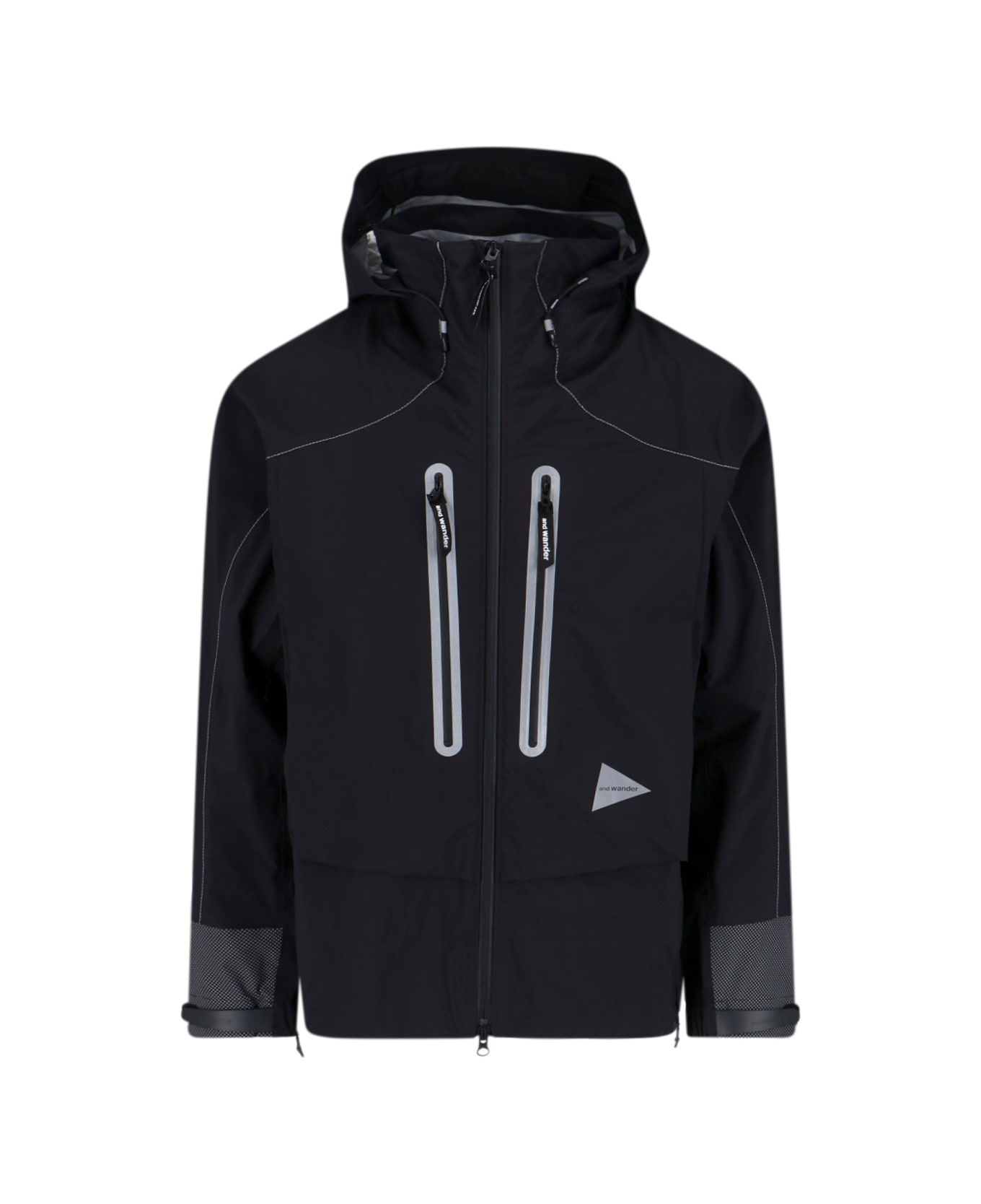 and Wander "PERTEX SHIELD" jacket in waterproof black fabric with adjustable drawstring hood, double zip closure, straight sleeves, two front zip pockets, contrasting logo detail on the front, contrasting cuff trims, straight hem.