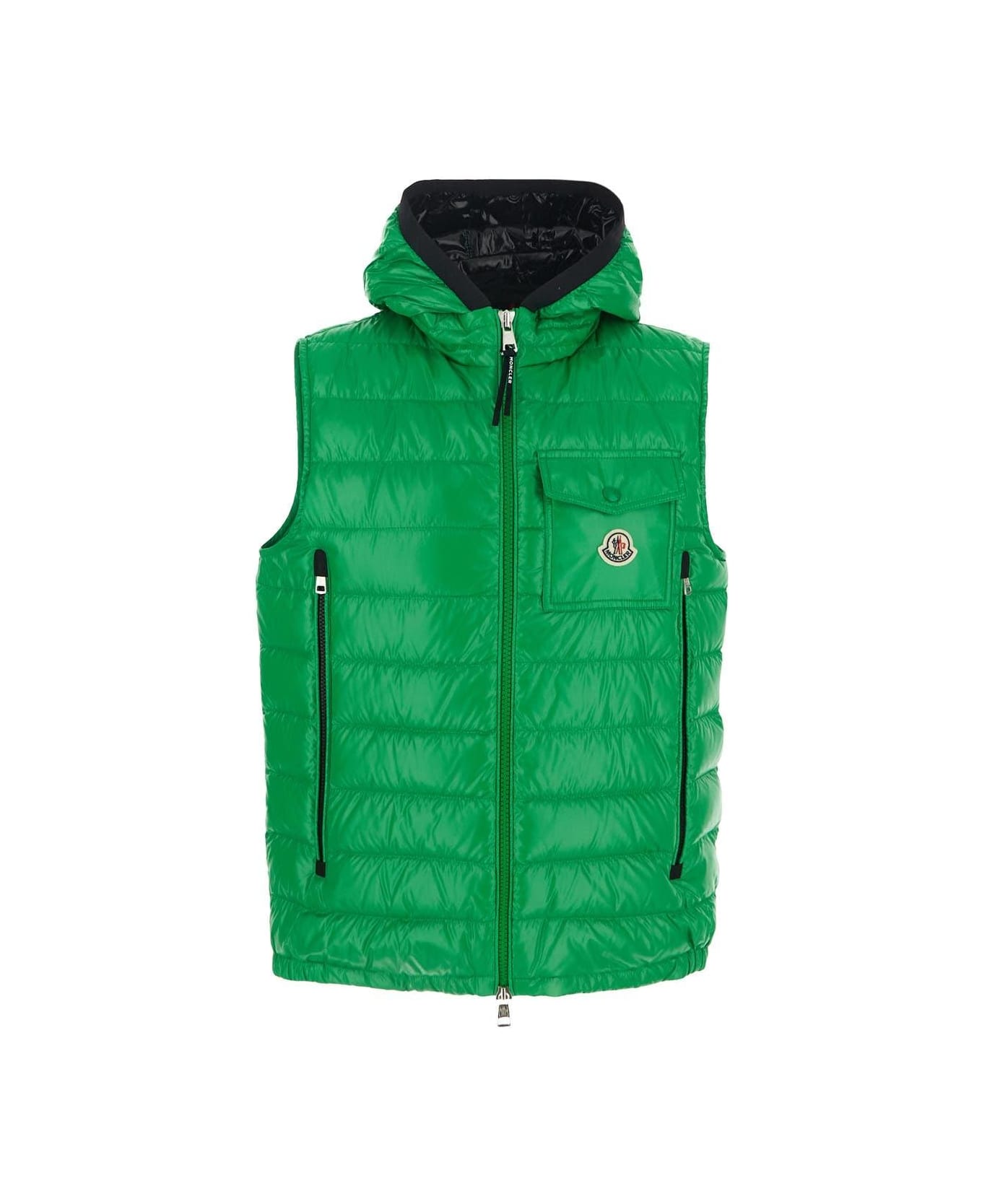 Moncler Jacket In Green Polyester With Zip Fastening. The Item Is Featured By Logo Patch, Side Pockets And Hoodie.