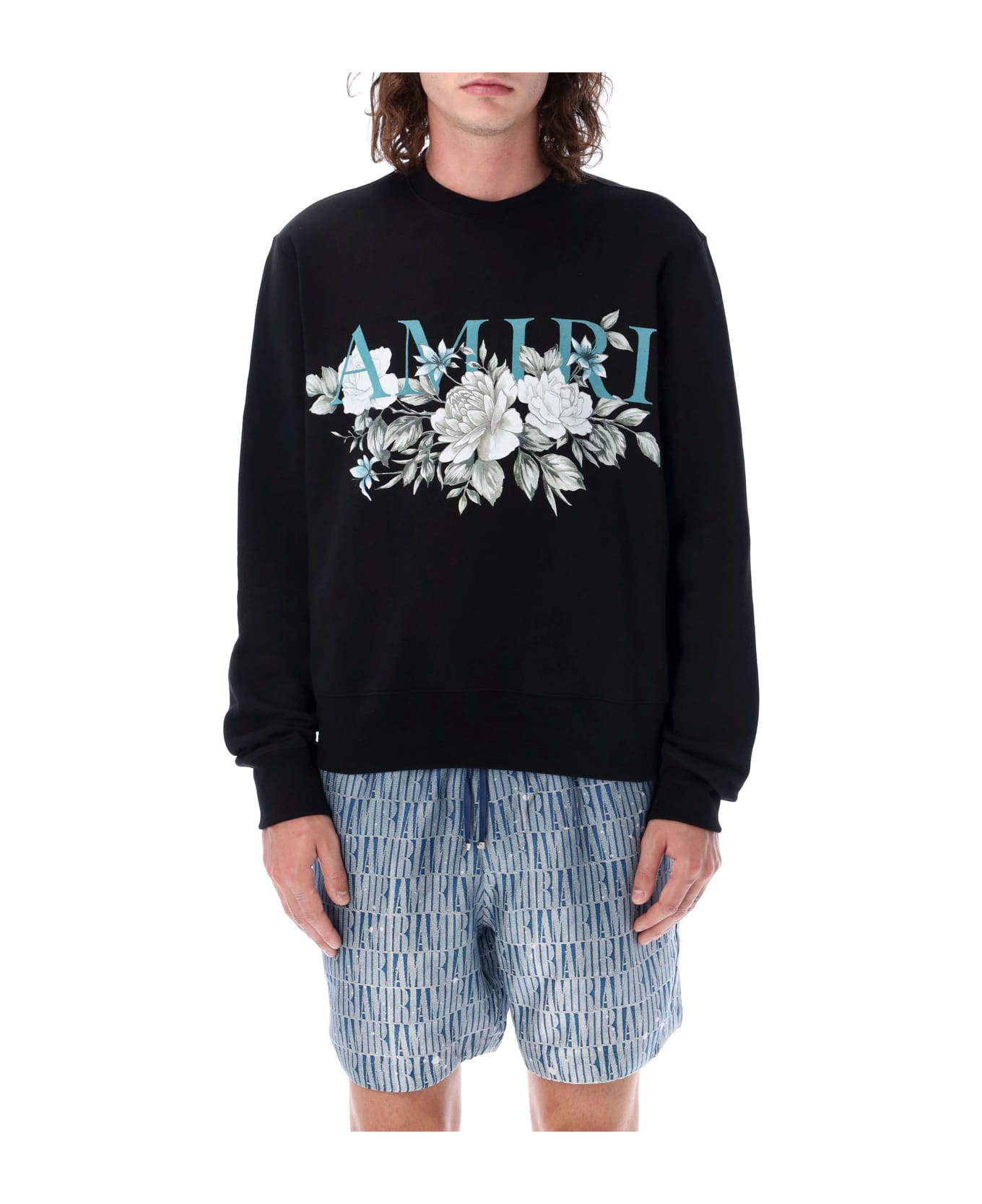Floral Amiri Logo Sweatshirt. Featuring: Ribbed Round Neck Long Sleeves Floral Amiri Logo Print At Front Plain Back Straight Hem Model Is 1,90 M Tall And He Is Wearing Size L