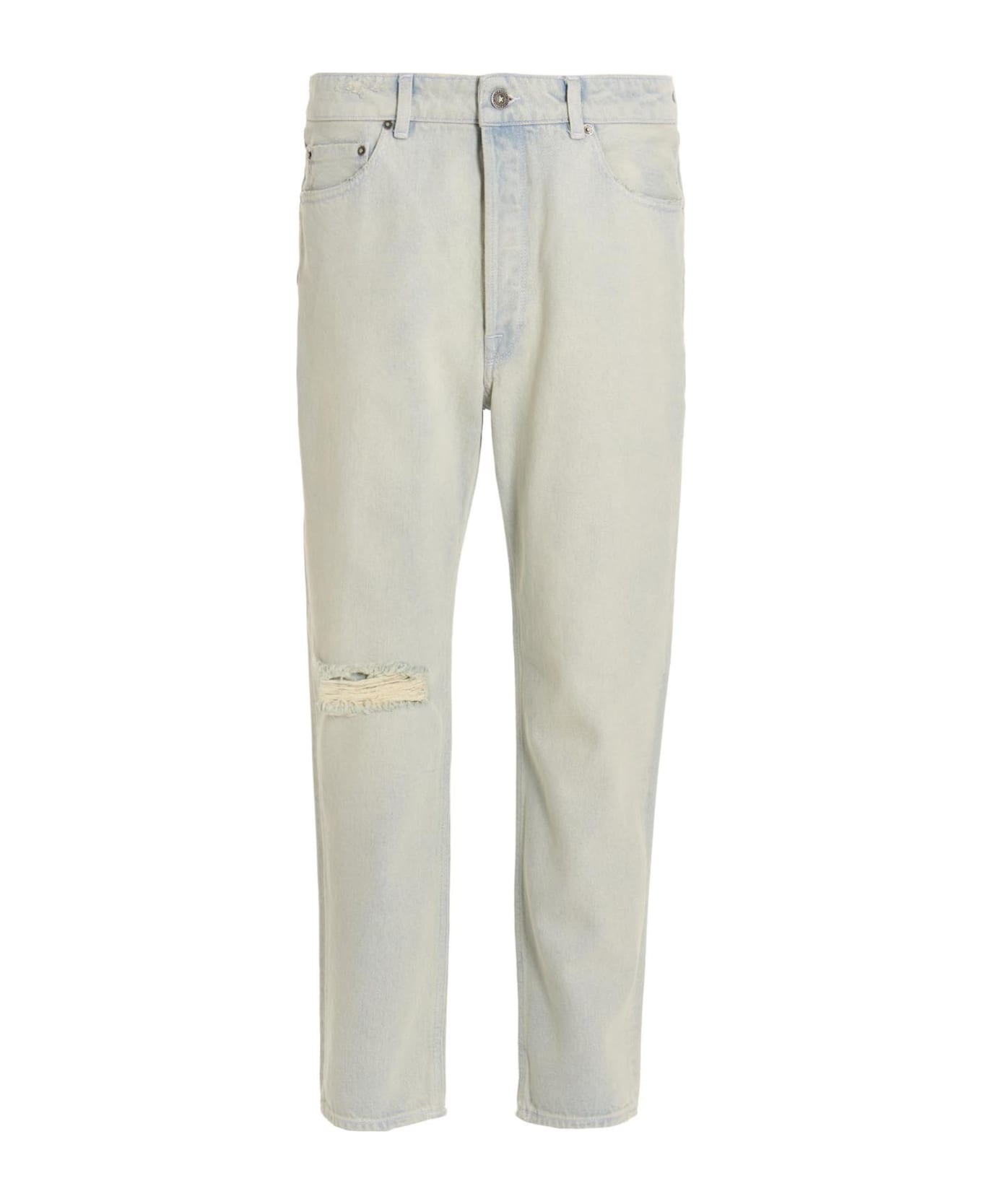 Pant Happy' bleached cotton denim jeans with button closure, five pockets, used and ripped details and a logo patch at the back.