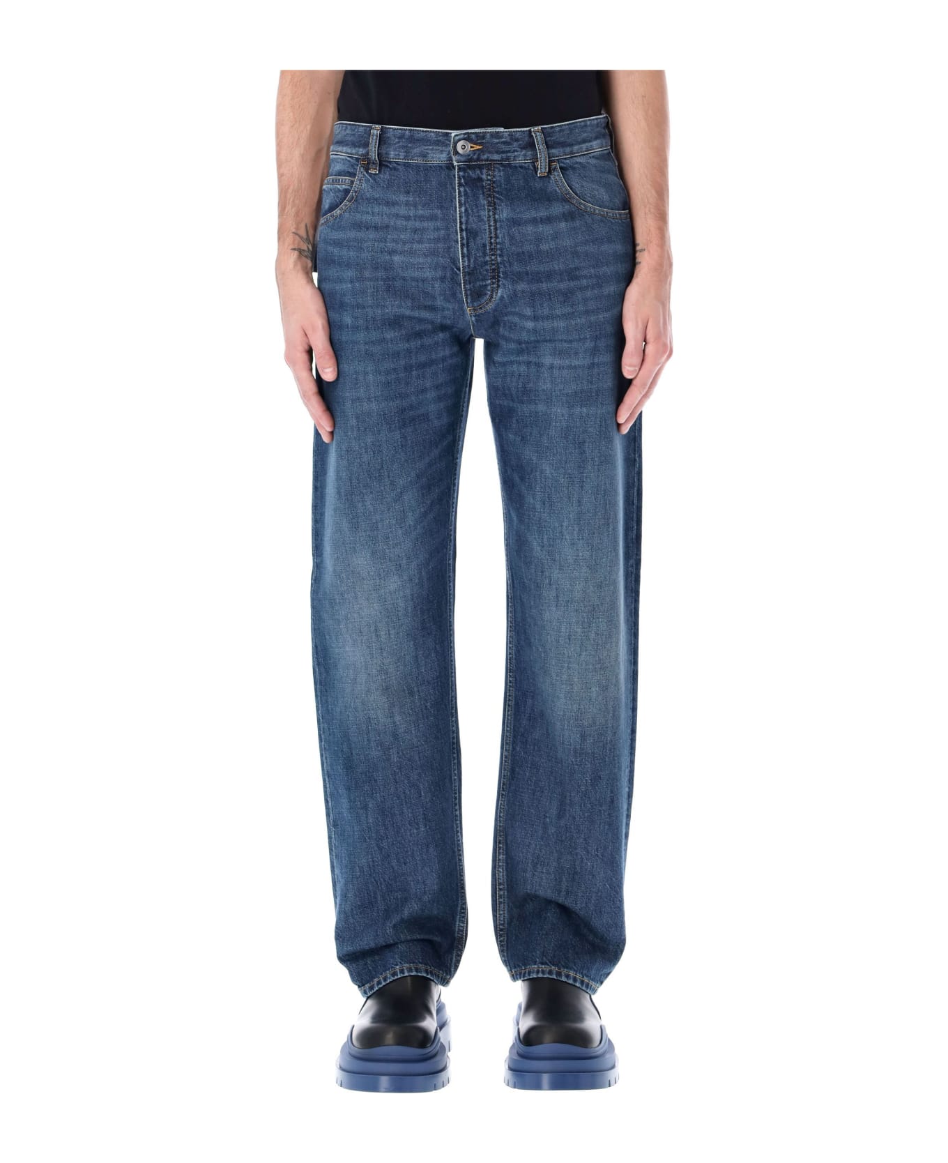 Cotton Medium Washed Straight Denim By Bottega Veneta. Featuring: Medium Waist Button Fastening Belt Loops Straight Leg Medium Wash Indigo Green Leather Patch At Back Model Is 1,90 M Tall And He's Wearing Size 48