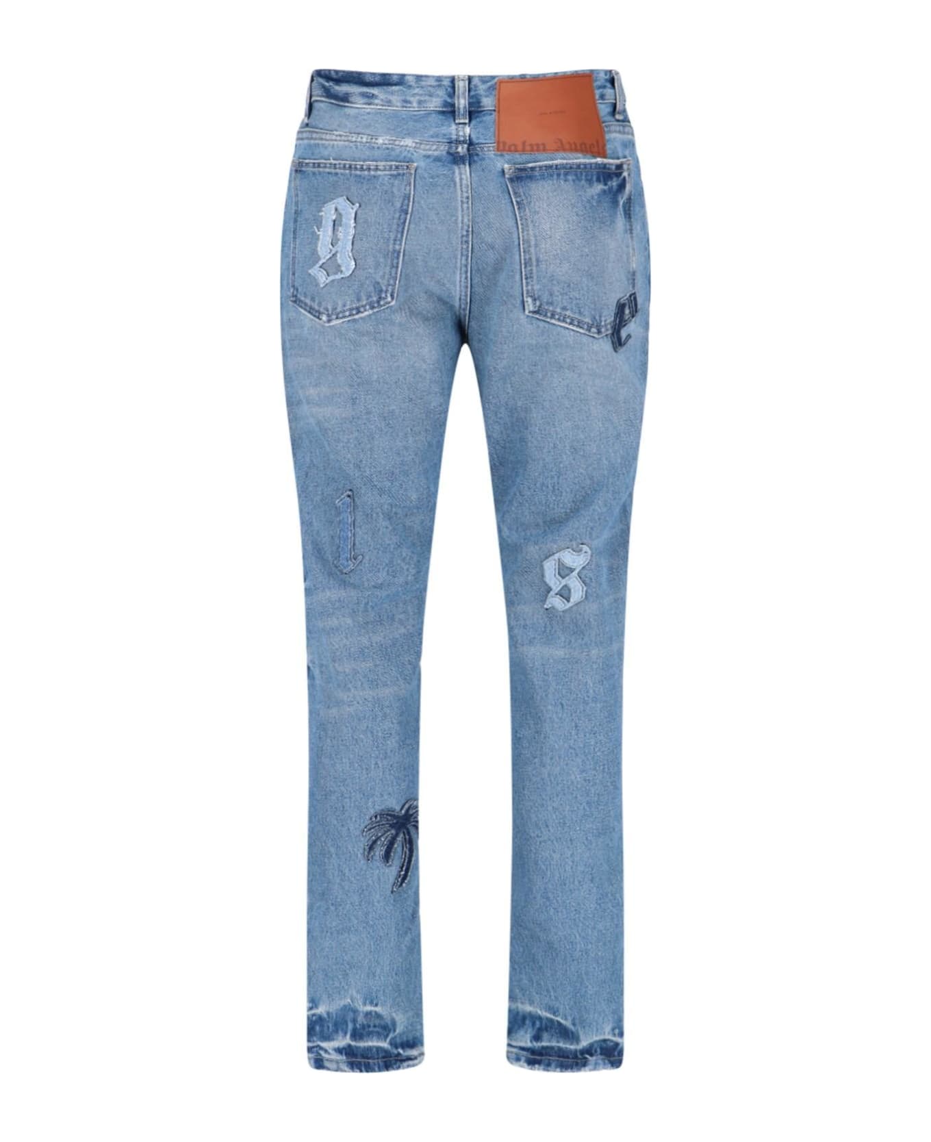 Palm Angels straight leg jeans in light blue denim with mid waist, belt loops, button and zip closure, five-pocket design, all-over embroidered logo lettering patch, leather logo patch appliqu n the back.
