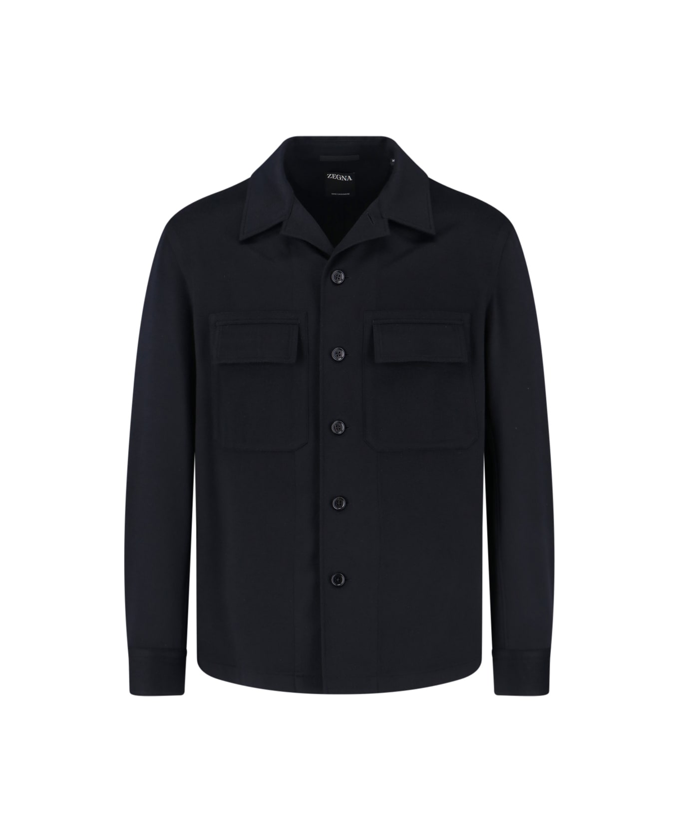 Zegna 'Alba' black cashmere shirt jacket with classic collar, button closure, two front pockets, button cuffs, straight hem. Composition: 100% Cashmere