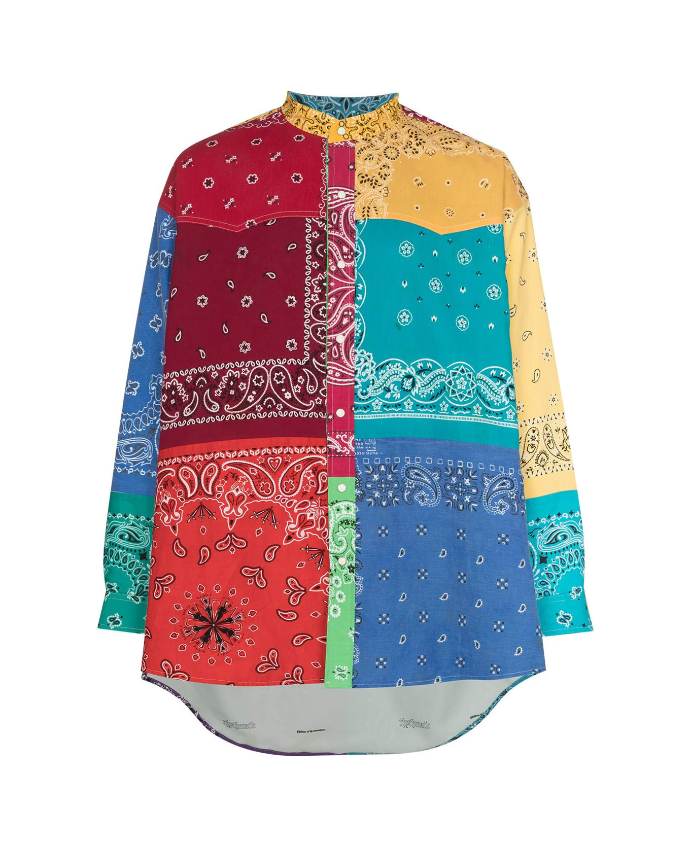 Multicolour cotton bandana-print long-sleeve shirt from Children Of The Discordance featuring colour-block design, bandana print, mandarin collar, front button fastening, long sleeves, buttoned cuffs and curved hem.