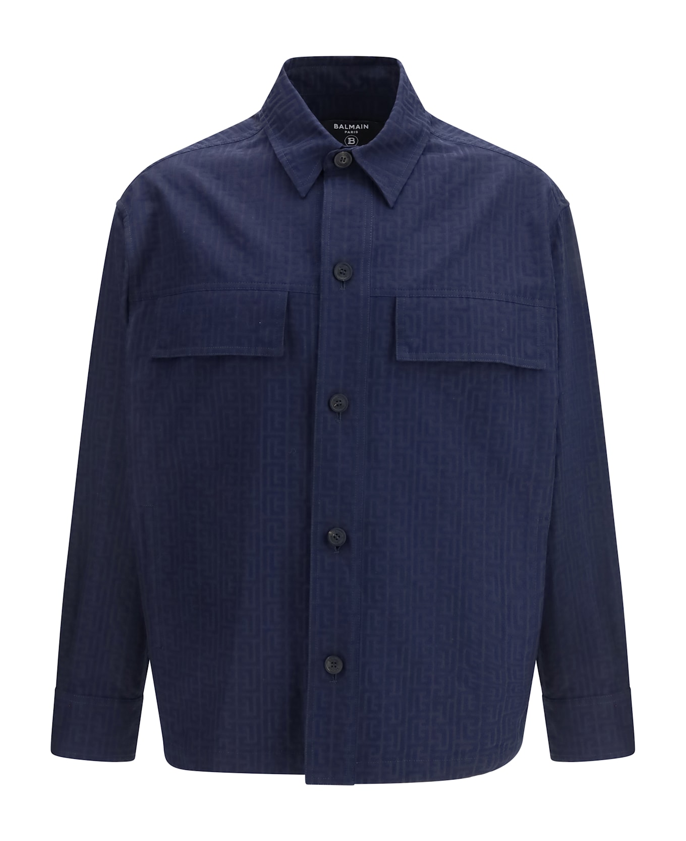 The cotton monogram jacquard overshirt by balmain showcases the house s signature aesthetic through a structured jacquard that highlights the iconic monogram motif. designed with a point collar, long sleeves, and a clean button fastening, it features two flap chest pockets that enhance its utilitarian appeal. the relaxed fit completes a versatile silhouette, ideal to be worn as a shirt or layered as a light overshirt.