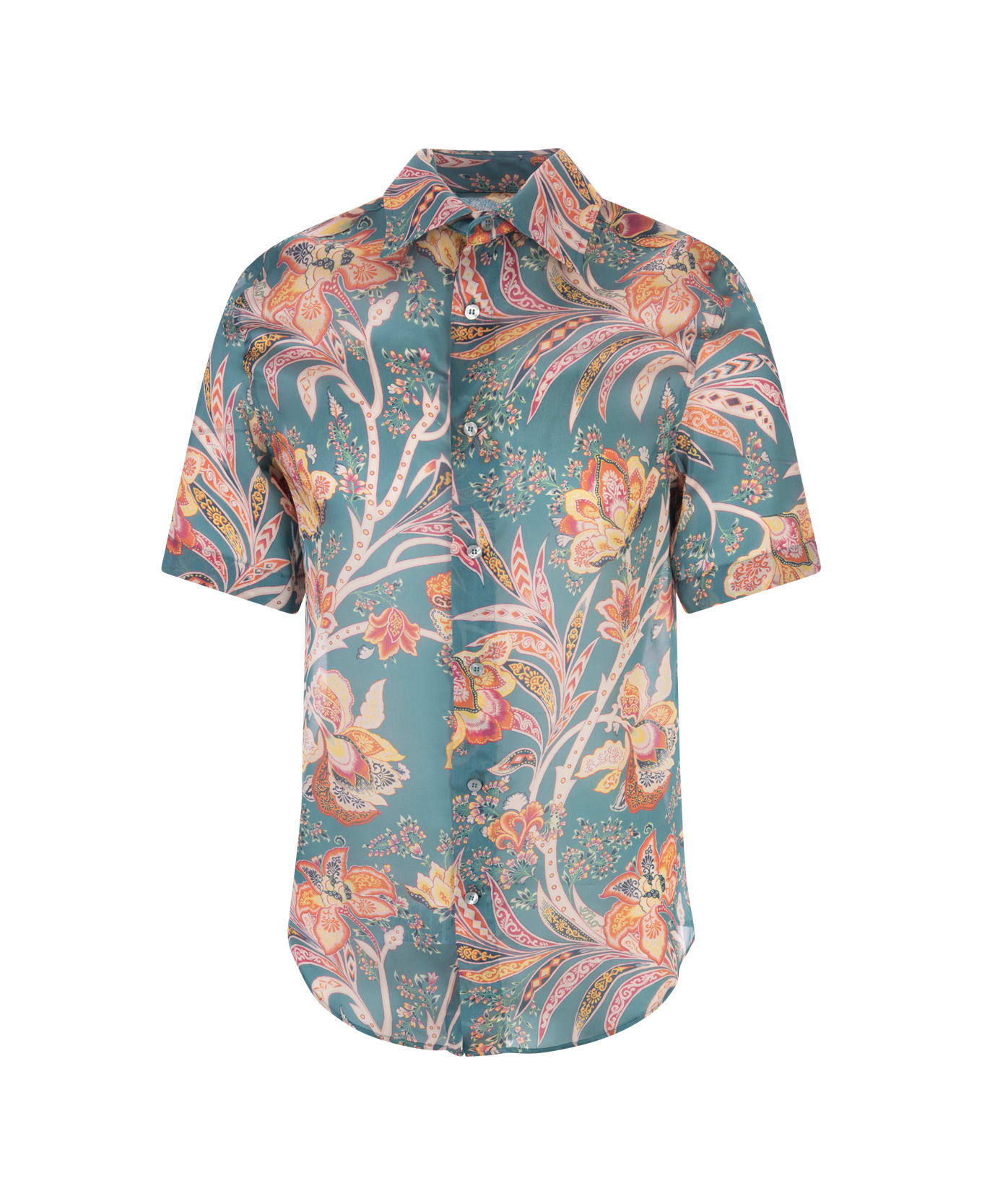 Etro shirt for men made of petrol green silk and embellished with a contrasting color ramage print. Designed with a pointed collar, short sleeves, button closure and side slits. Regular fit. Composition: 100% Silk