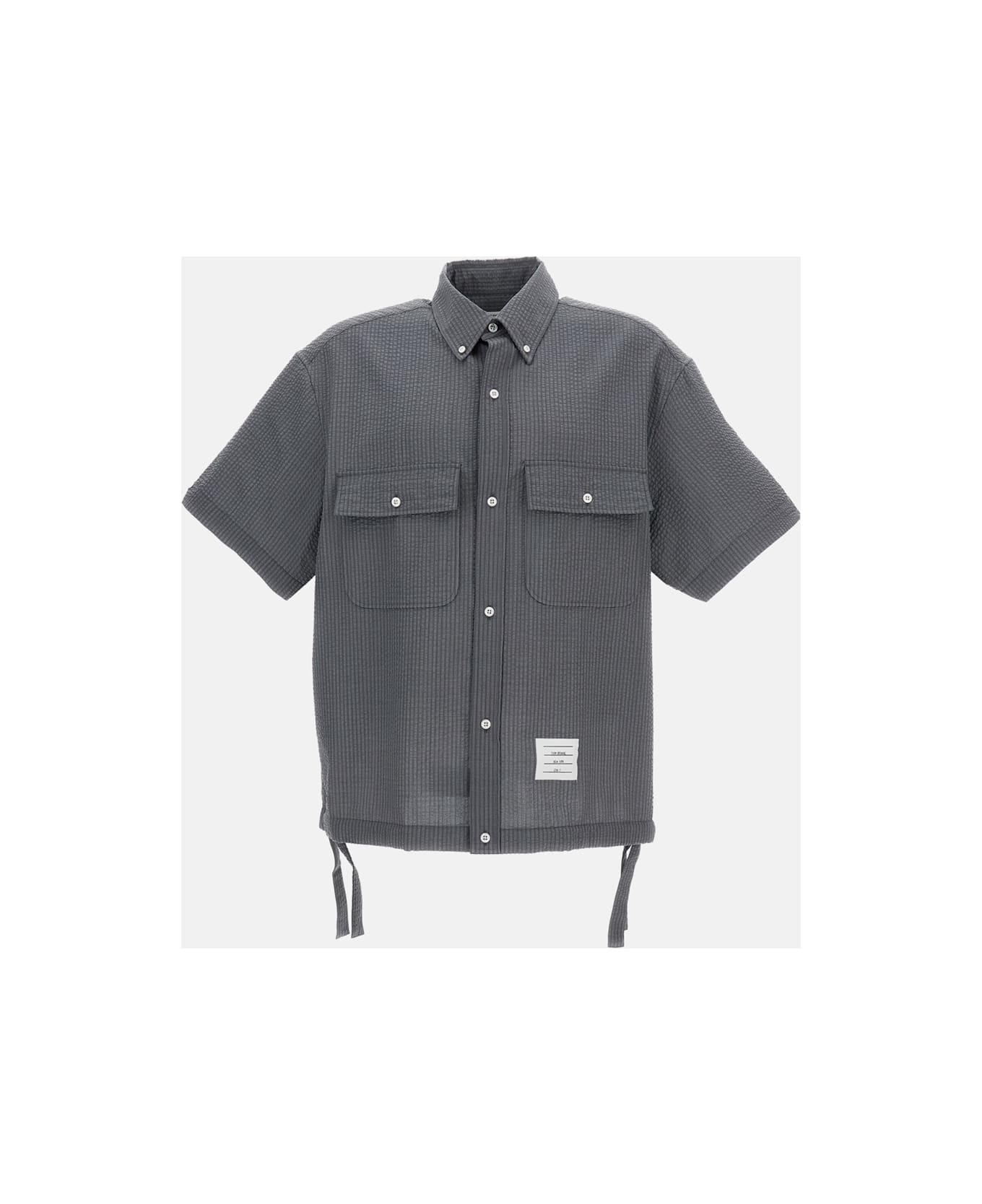 Short-sleeve wool shirt Seersucker effect Boxy cut Oversized fit Wide sleeves Button-down collar Full central button fastening Drawstring at the hem Chest patch pockets with button Logo patch applied on the front Tricolor grosgrain tab on the back Color: gray Made in Italy Composition: 100% Wool