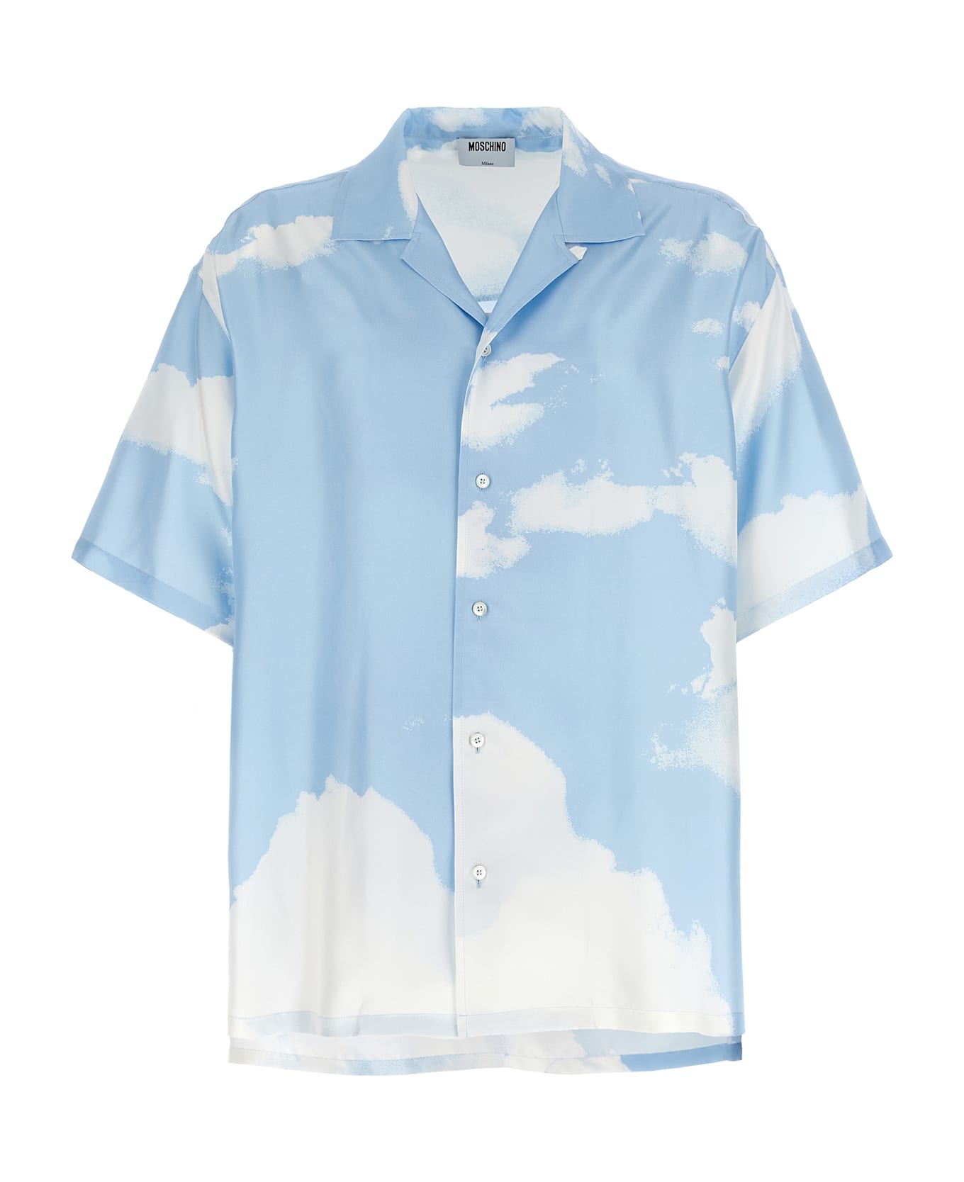 Silk shirt, all-over print, V-neck with lapels, button closure, asymmetric length, side splits, short sleeves.