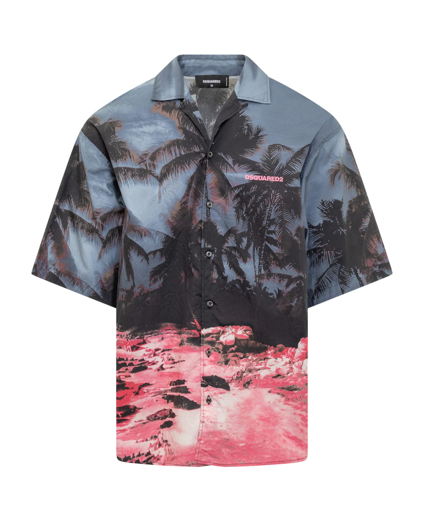 Short-sleeved shirt. Classic collar. Button closure. Pattern with palm trees and fluorescent waves. Logo printed on the chest.