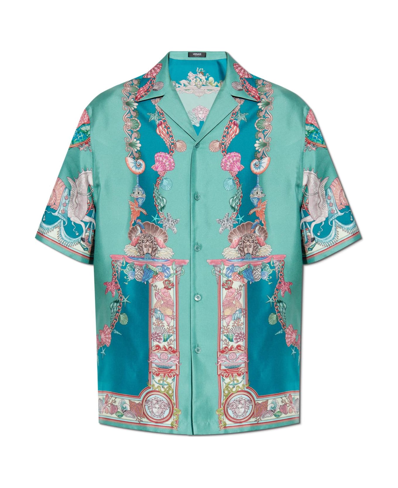 Epitomizing timeless sophistication and modern artistry, the Coral Theatre Silk Shirt by Versace is an ode to the brand's signature boldness. Meticulously crafted from smooth, lustrous silk, this classic short-sleeve shirt boasts a relaxed fit, a full-length button closure, and a refined Kent collar. The shirt is adorned with a mesmerizing, multi-element marine-inspired print in vivid turquoise blue, featuring ornamental columns woven with corals, shells, seahorses, fish, and mythical sirens. The back showcases intricate illustrations central mermaid statuettes surrounded by elaborate underwater motifs exhibiting Versace's commitment to opulent detail and contemporary flair. Distinguished by the unmistakable Versace heritage, this piece merges Italian tradition with avant-garde design, offering a distinctive expression of individuality and luxury. Why choose this product? Exquisite pure silk for exceptional comfort and sheen Striking marine-themed print exclusive to Versace Impeccable craftsmanship with timeless cut Perfect balance of classic and contemporary style Signature piece from an iconic fashion house