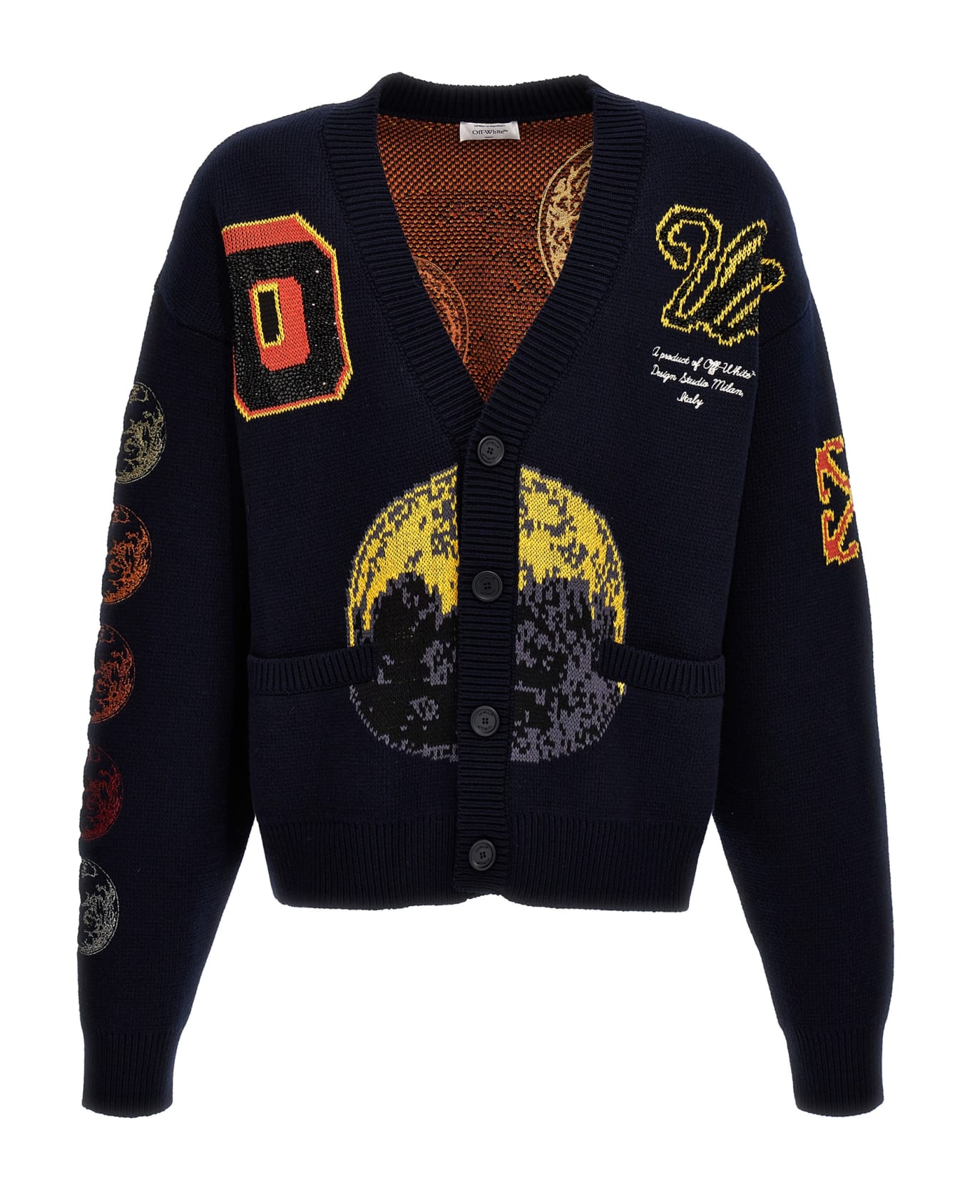'Cristy moon phase' wool blend cardigan with button closure, V-neck, contrast embroidery, inlays and crystal applications.