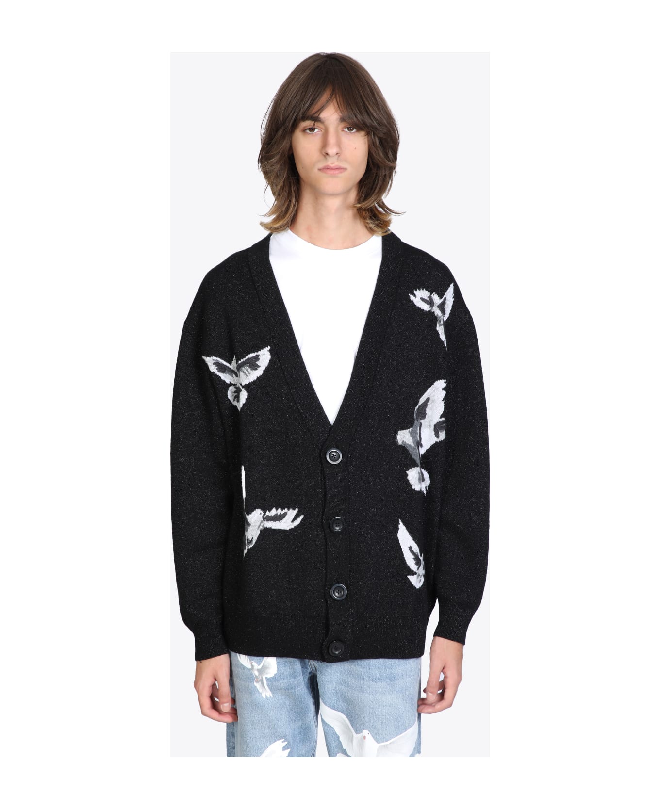Black lurex cardigan with white doves jacquards pattern. Buttons closure. Ribbed cuffs and bottom hem. Rlaxed fit. The model is 190 cm and wears size M. Composition: 70% cotton 20% nylon 10% silk. Made in China.