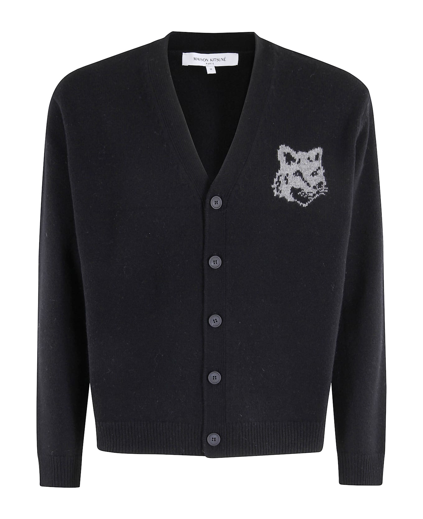 Cardigan - Maison Kitsuné - Fox head intarsia pattern - Black color - V-neck - Long sleeves - Embroidered logo top - Front button closure
