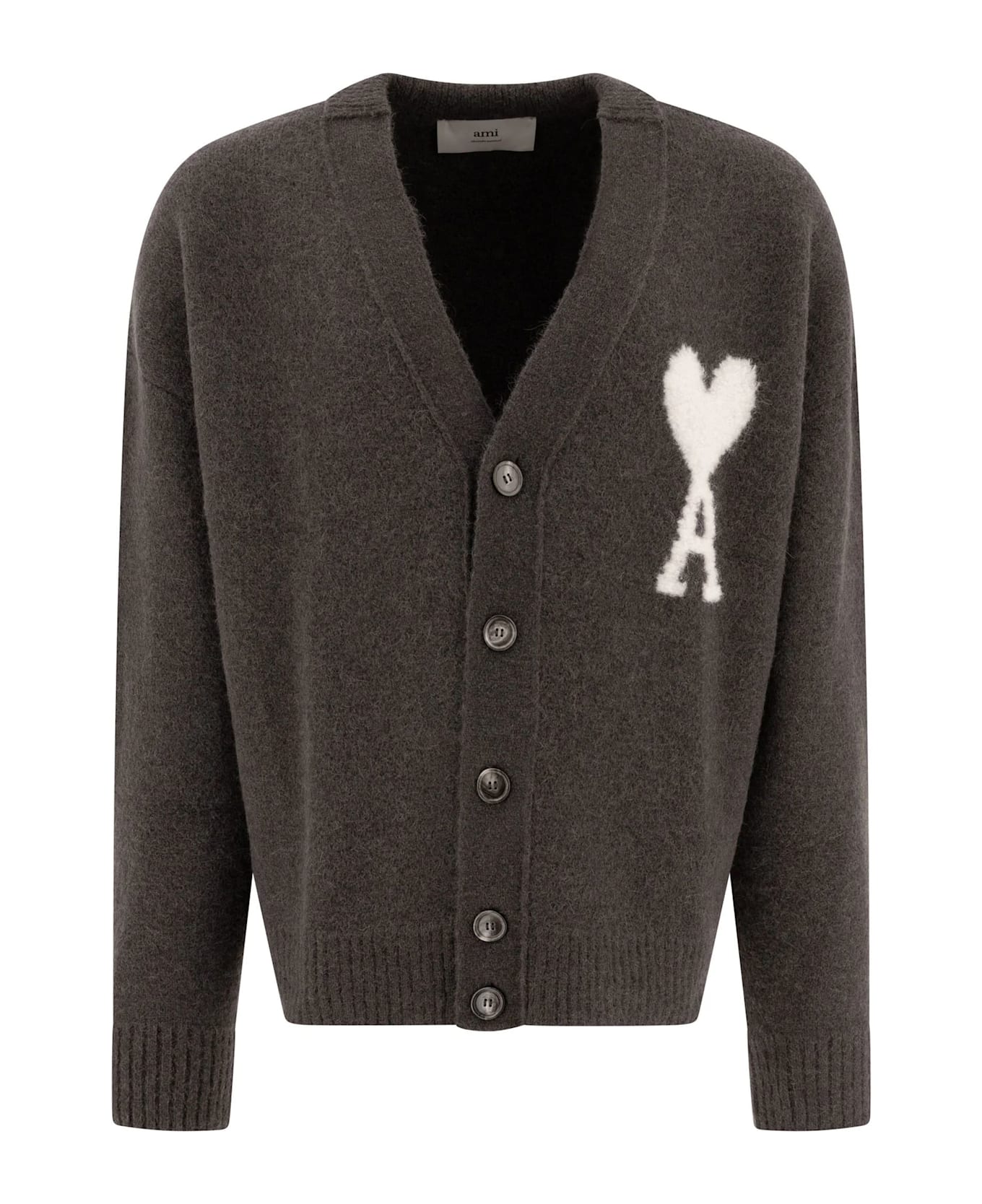 Dark grey alpaca wool-blend cardigan, knitted construction, signature Ami de Coeur monogram motif, V-neck, front button fastening, ribbed cuffs and hem Composition: Alpaca Wool, 71% , Polyamide, 22% , Wool, 4% , Spandex/elastane, 3%