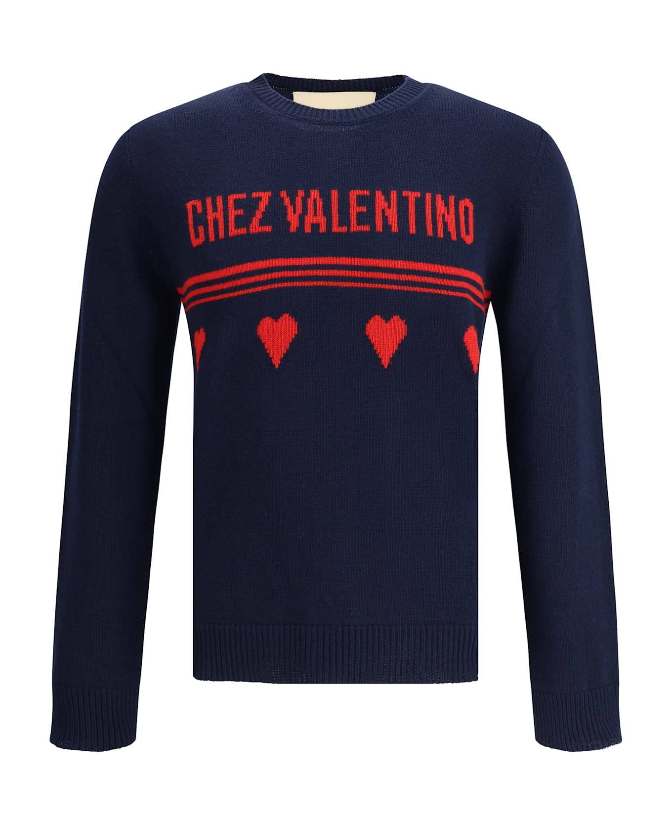 The chez valentino wool sweater by valentino is a timeless and refined garment. featuring a ribbed crew neck and ribbed hem and cuffs, it offers a comfortable and stylish fit. the iconic chez valentino signature on the front adds a distinctive and recognizable touch, making the sweater ideal for a sophisticated, minimalist look.
