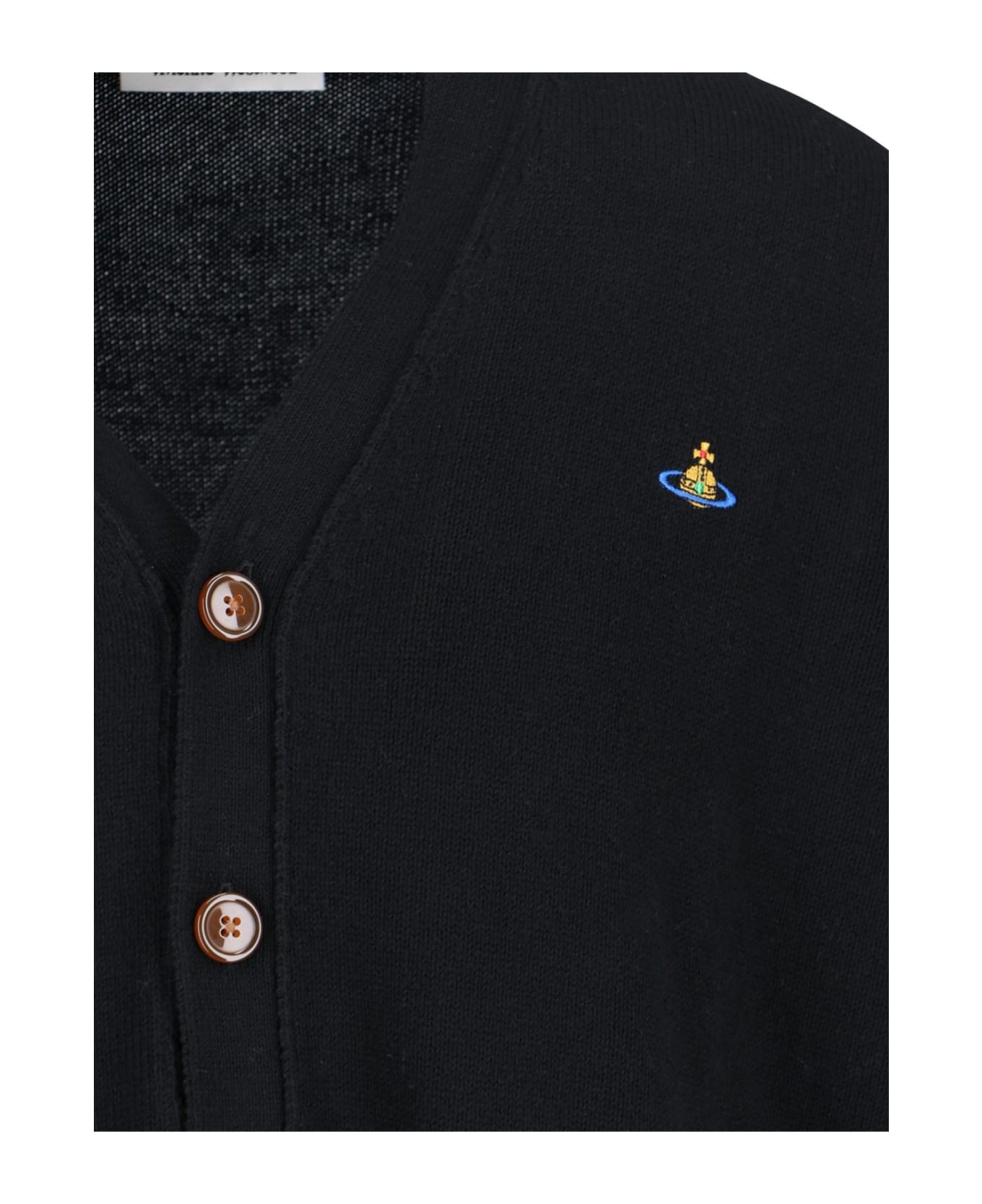Vivienne Westwood logo cardigan in black cotton and cashmere with V-neck, brown button closure, multicolor 'Orb' embroidered logo on the front, two flat front pockets, ribbed trim, and straight hem.