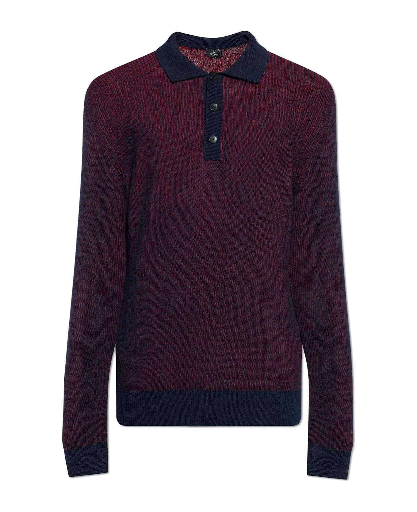Discover an elevated wardrobe essential with this long-sleeve polo by Etro, masterfully crafted in pure wool for a sumptuously soft touch and superior warmth throughout the fall and winter seasons. A refined, gently tailored silhouette ensures timeless elegance, further enhanced by a uniquely subtle stripe pattern in deep bordeaux and navy blue. The delicate ribbing lends sophisticated texture and visual depth, epitomizing the exclusive character of the piece. Iconic Italian heritage permeates every detail, from the solid navy collar offering a striking contrast to the meticulously finished cuffs and ribbed hemline. The tasteful three-button placket completes the look with understated distinction. This polo embodies the impeccable artistry and rich legacy of Etro, seamlessly blending comfort and luxury for the discerning wardrobe. Why Choose This Product? Exquisitely crafted from premium wool for exceptional comfort Sophisticated two-tone striped pattern for versatile styling Signature design and thoughtful finishing touches by Etro Ideal for refined layering during the cooler months Iconic Italian craftsmanship with a modern, tailored fit
