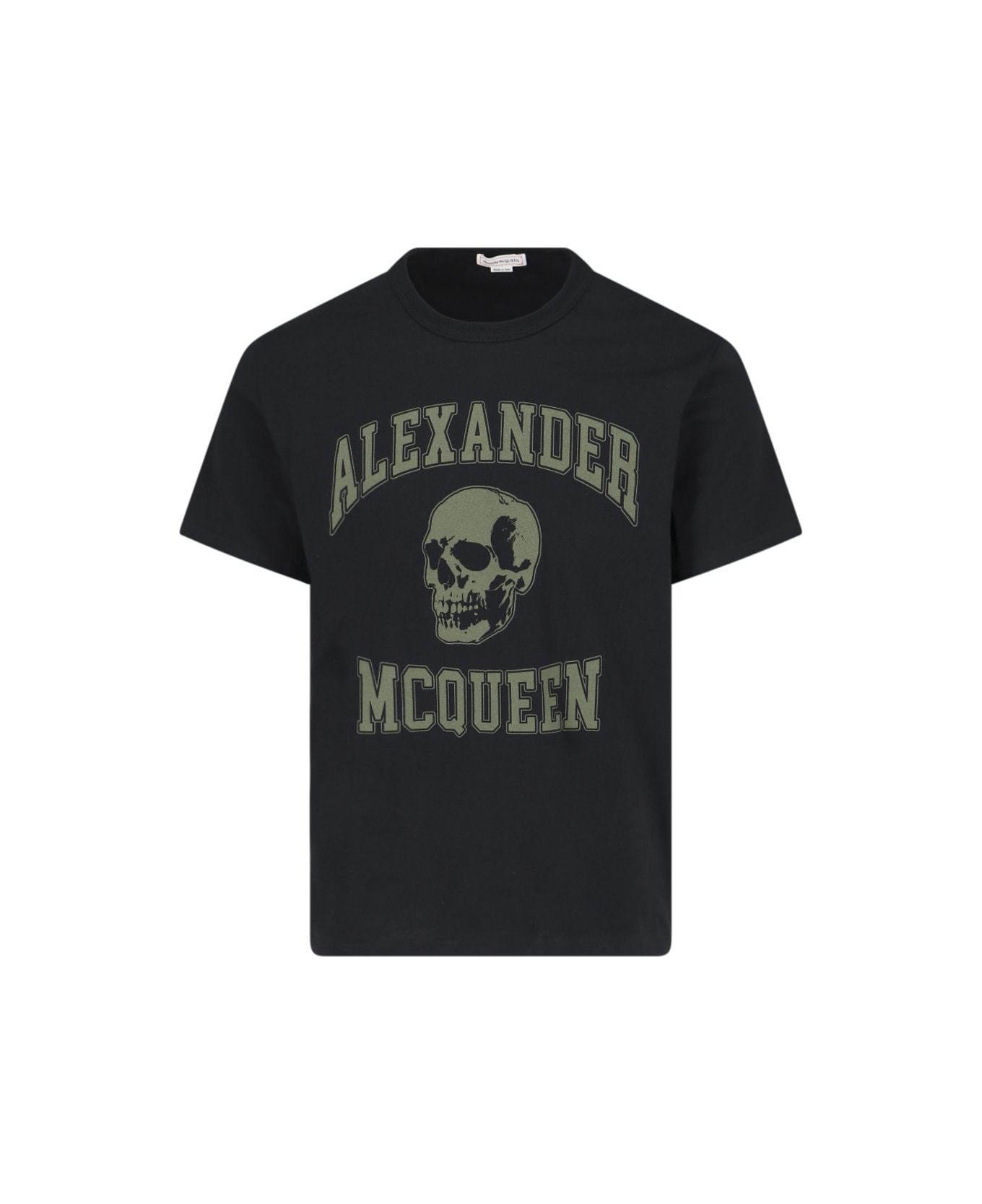 Alexander McQueen Varsity T-shirt in black cotton with crewneck, short sleeves, maxi logo print and green skull on the front, and straight hem. Composition: 100% Cotton Composition: 100% Cotton