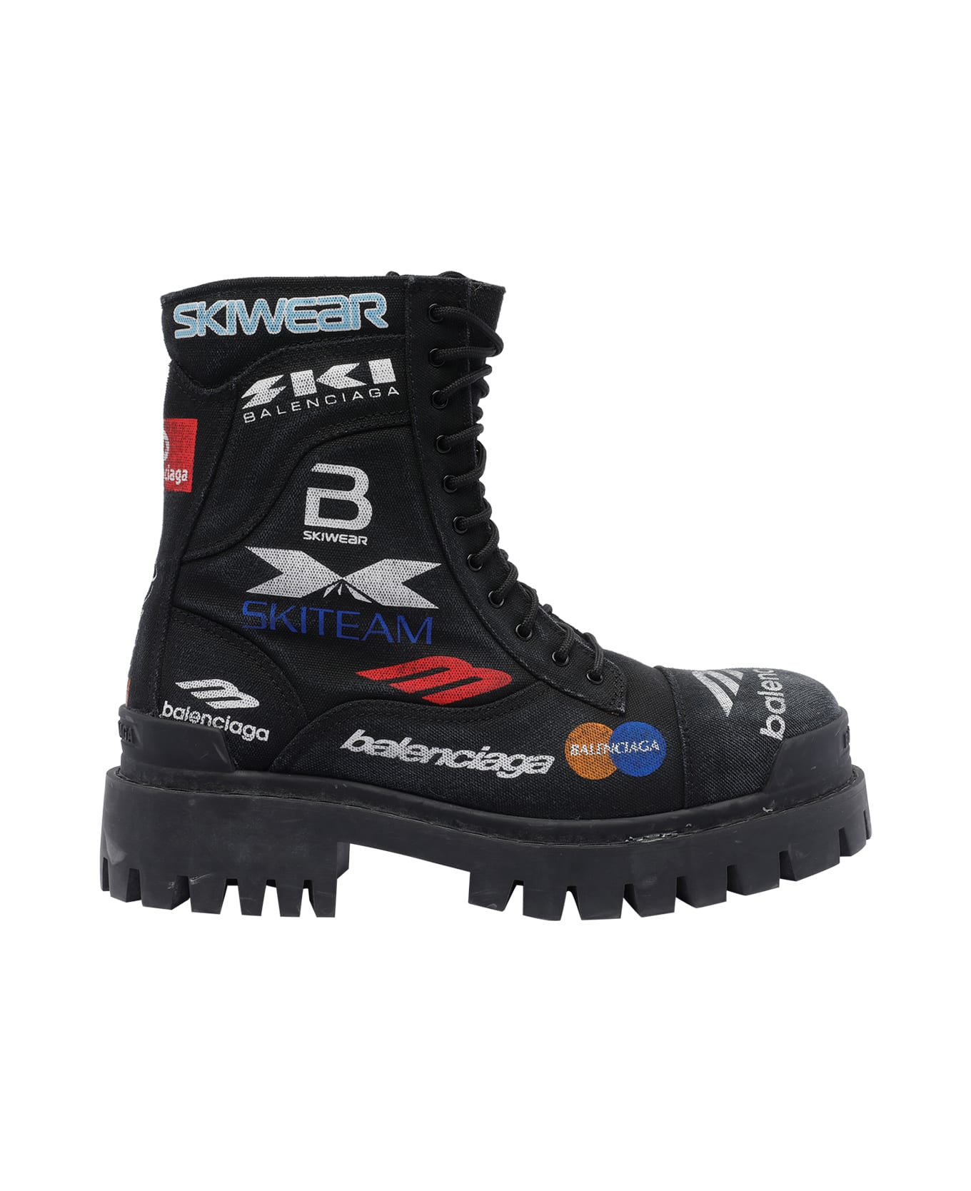 Balenciaga black Combat Strike boots, round toe, patches allover, laces closure, lateral zip closure Composition: 100% Fabric / Rubber Sole