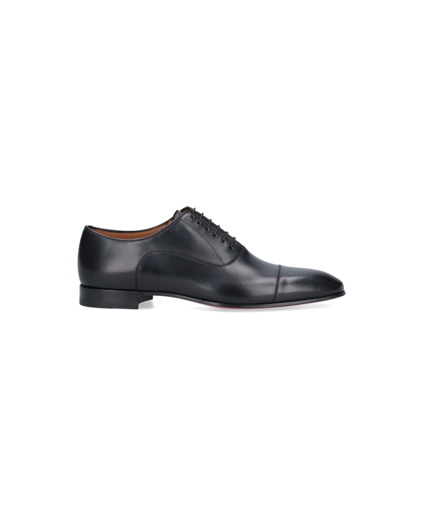 Christian Louboutin 'Greggo' black leather derby shoes with round toe, lace-up closure, front and side brogue details, leather sole.