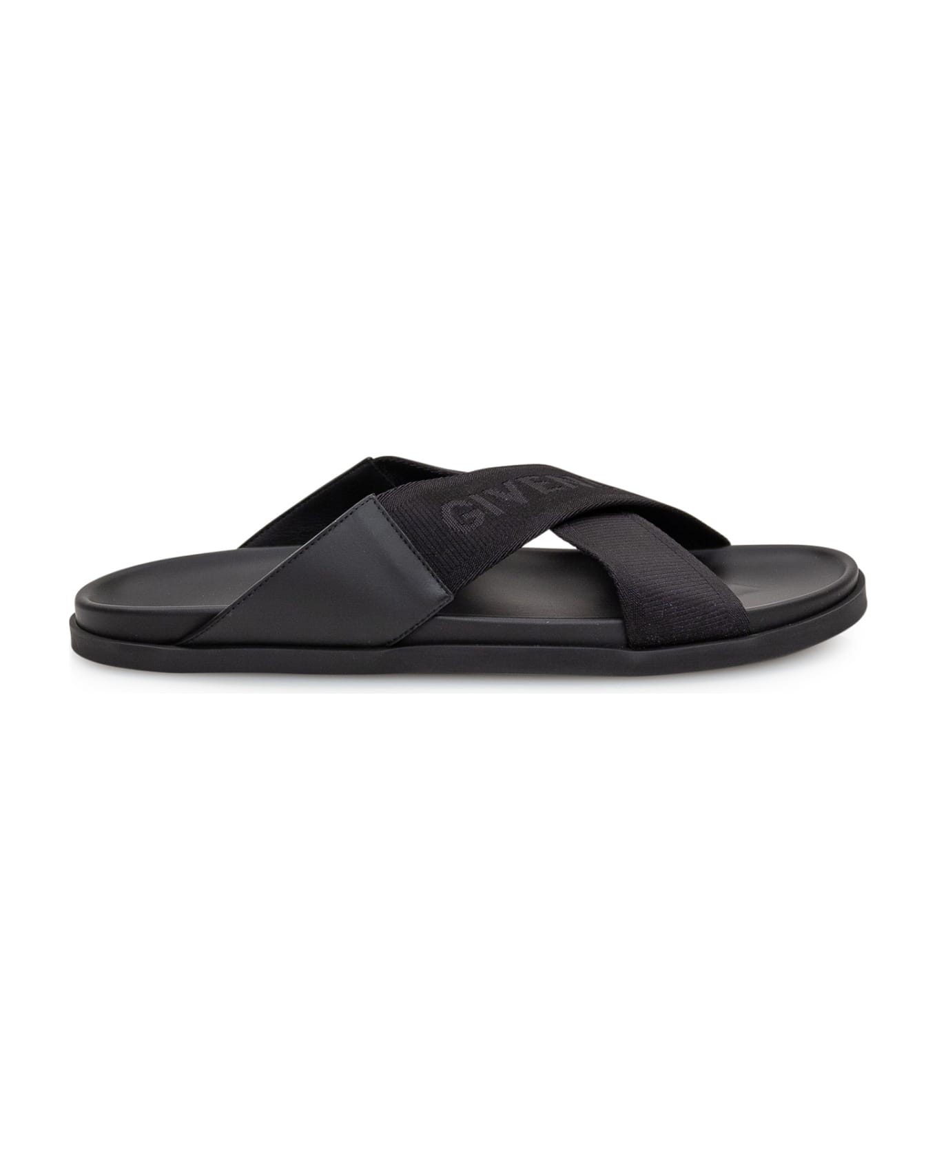 Low sandal. Slip-on. Crossed bands on the front with logo.