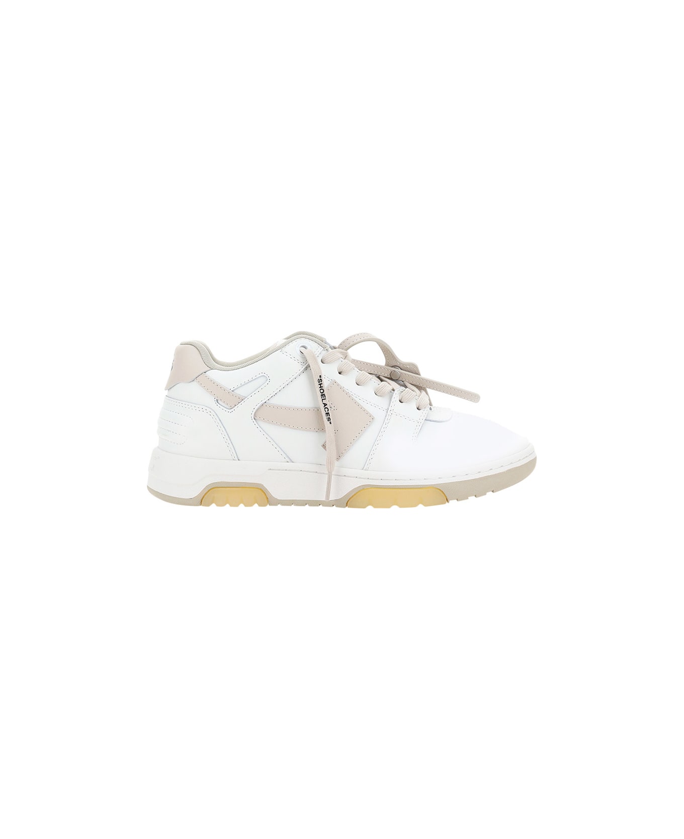 Out of office sneakers by off-white, iconic zipper tie tag on front, lace-up front closure, brand logo embossed on side panels, paneled design, iconic brand signature printed on front tab, perforated round toe.