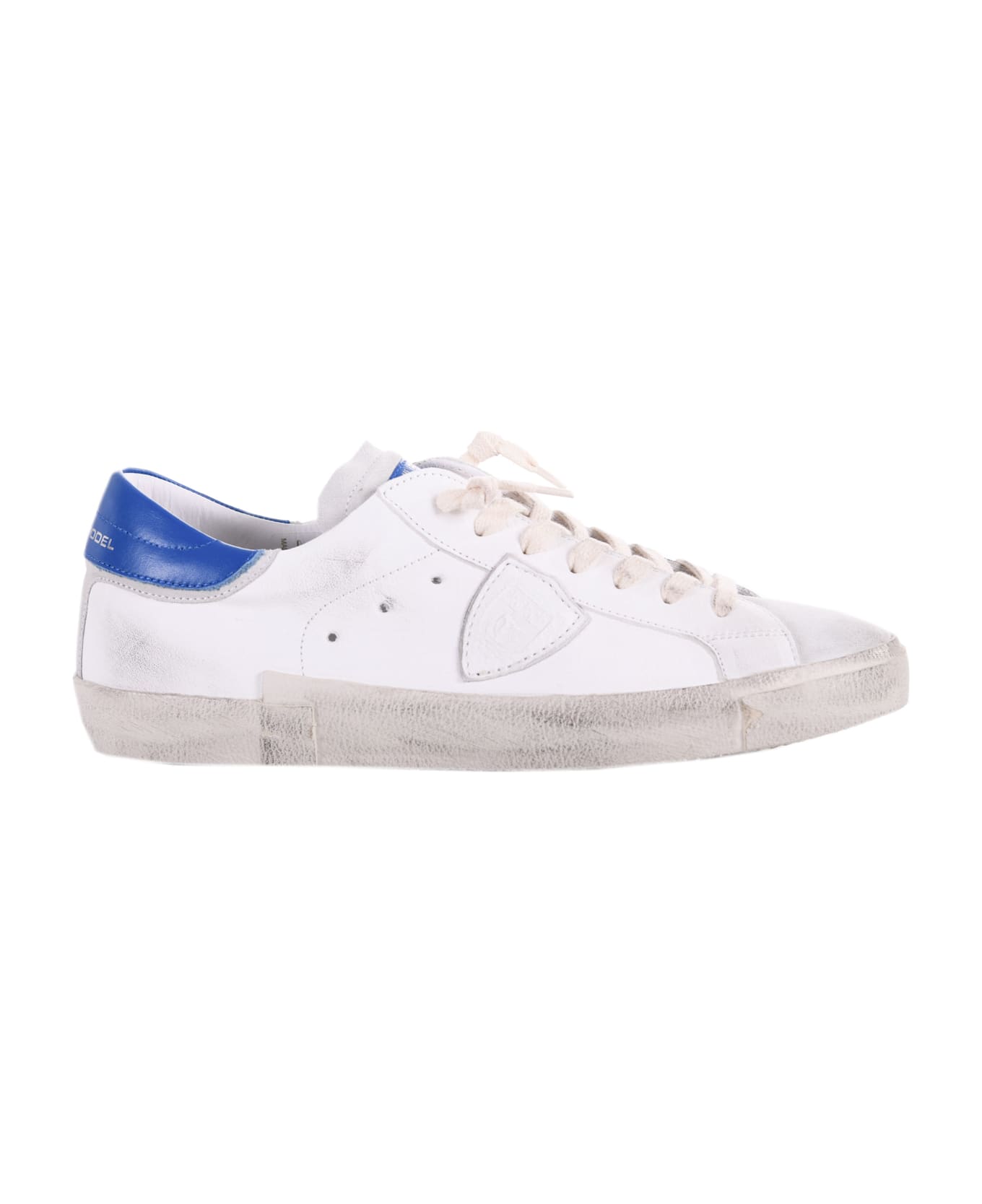 Philippe Model sneakers in white leather and suede with a used effect. Intentionally scratched and stained areas. Light blue leather insert on the back. Side logo. 25 mm rubber sole with a used effect. Size in photo 41 100% leather