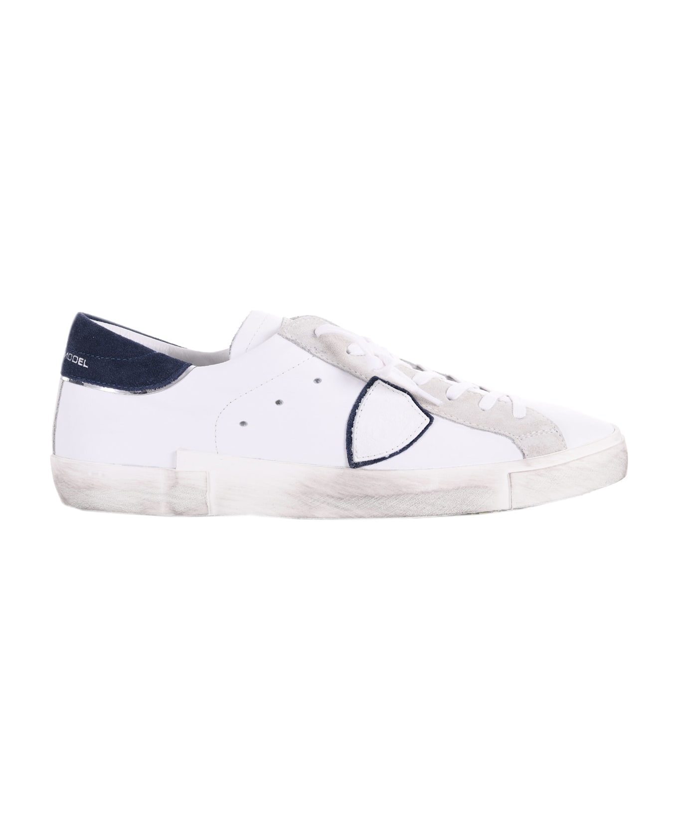Philippe Model sneakers in white leather with a used effect. Ice suede insert. Intentionally scratched and stained areas. Blue suede insert on the back. Side logo with blue profile. 25 mm rubber sole with a used effect. Size in photo 41 100% leather