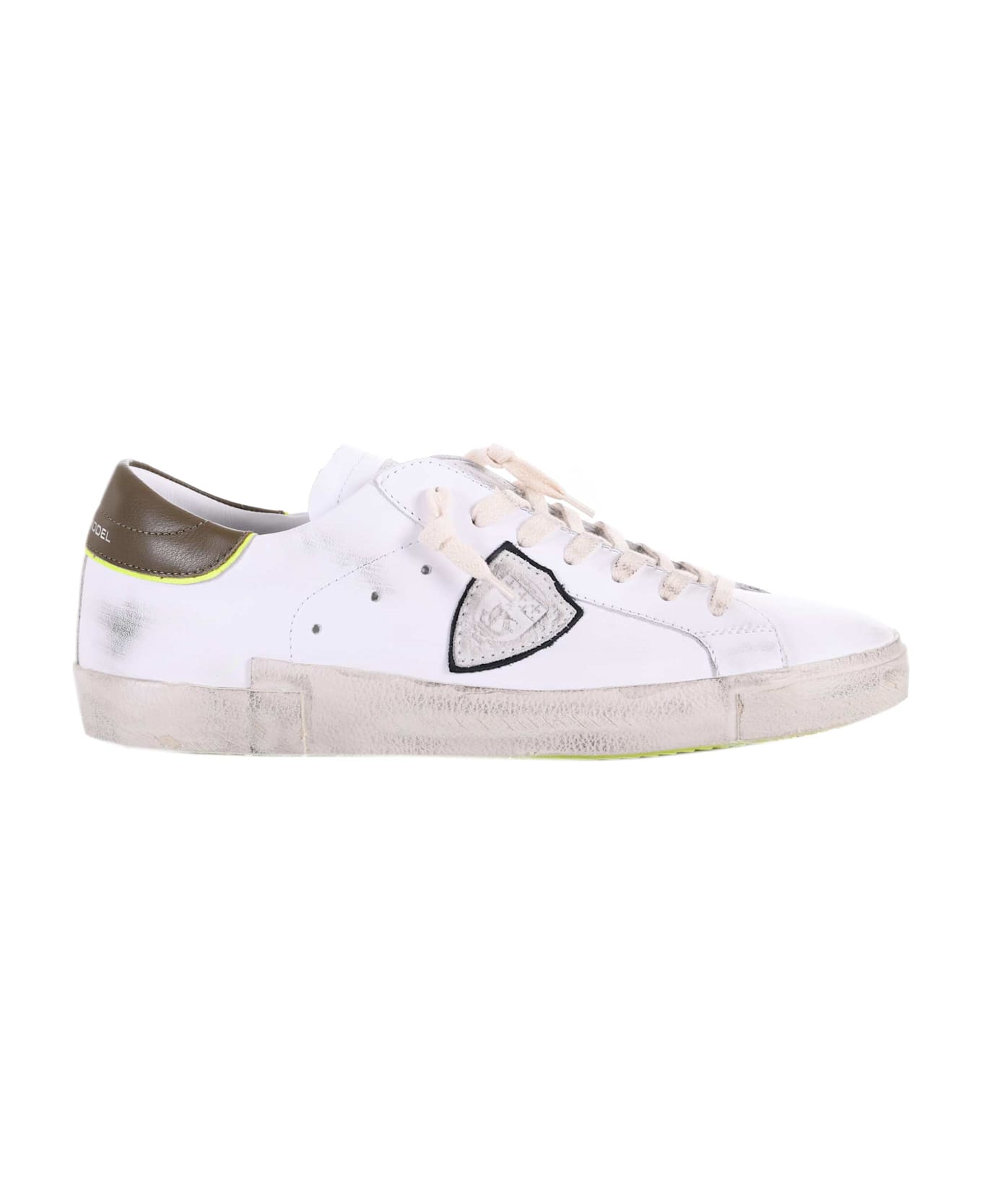 Philippe Model sneakers in white leather with a used effect. Intentionally scratched and stained areas. Brown leather insert on the back. Fluorescent yellow inserts. Side logo. 25 mm rubber sole with a used effect. Size in photo 41 100% leather