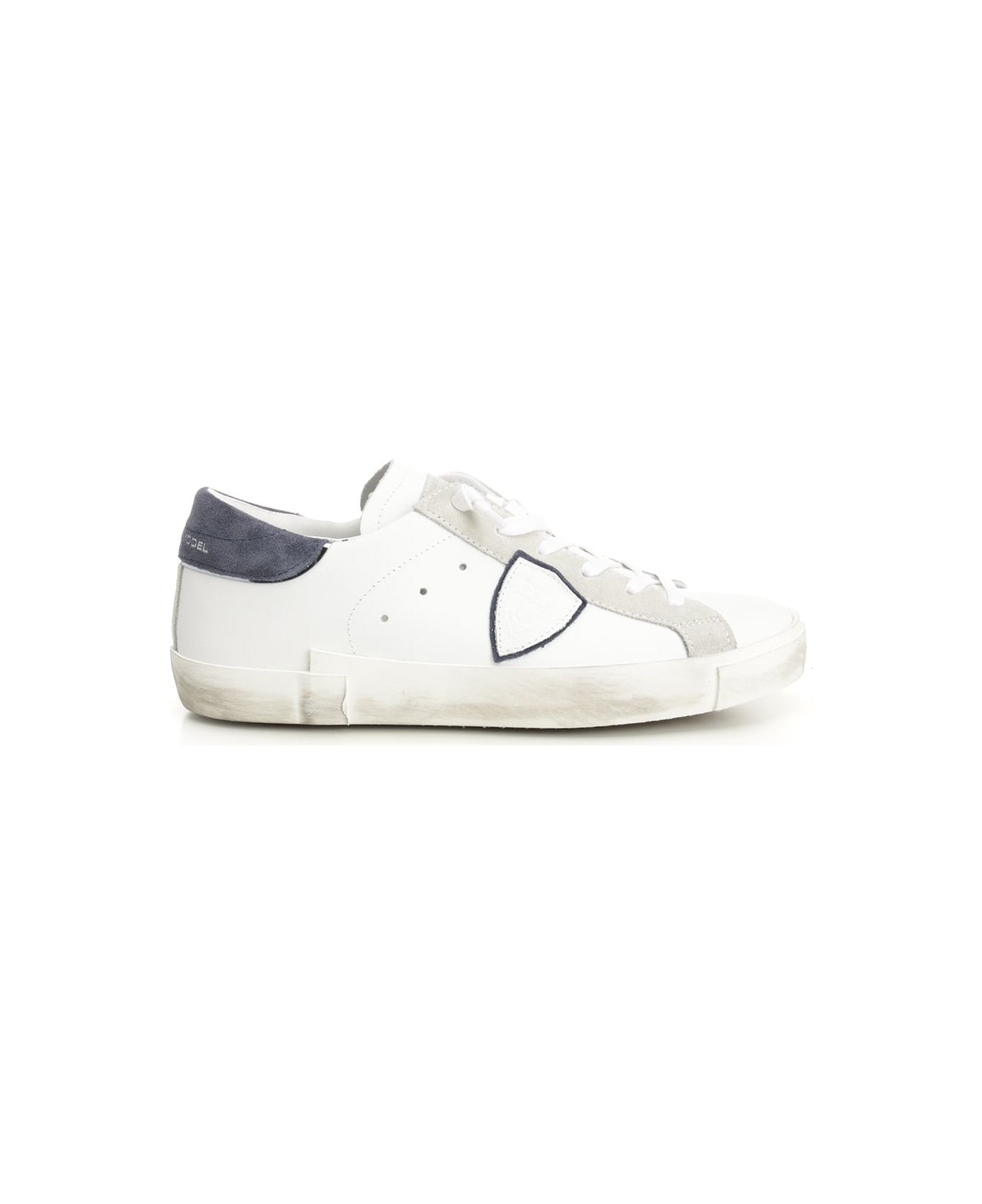 Philippe Model 'Prsx' sneakers in white leather with white details and a worn-effect sole, featuring the classic shield on the side, metal eyelets and flat laces, on the back there is a leather insert with black writing.