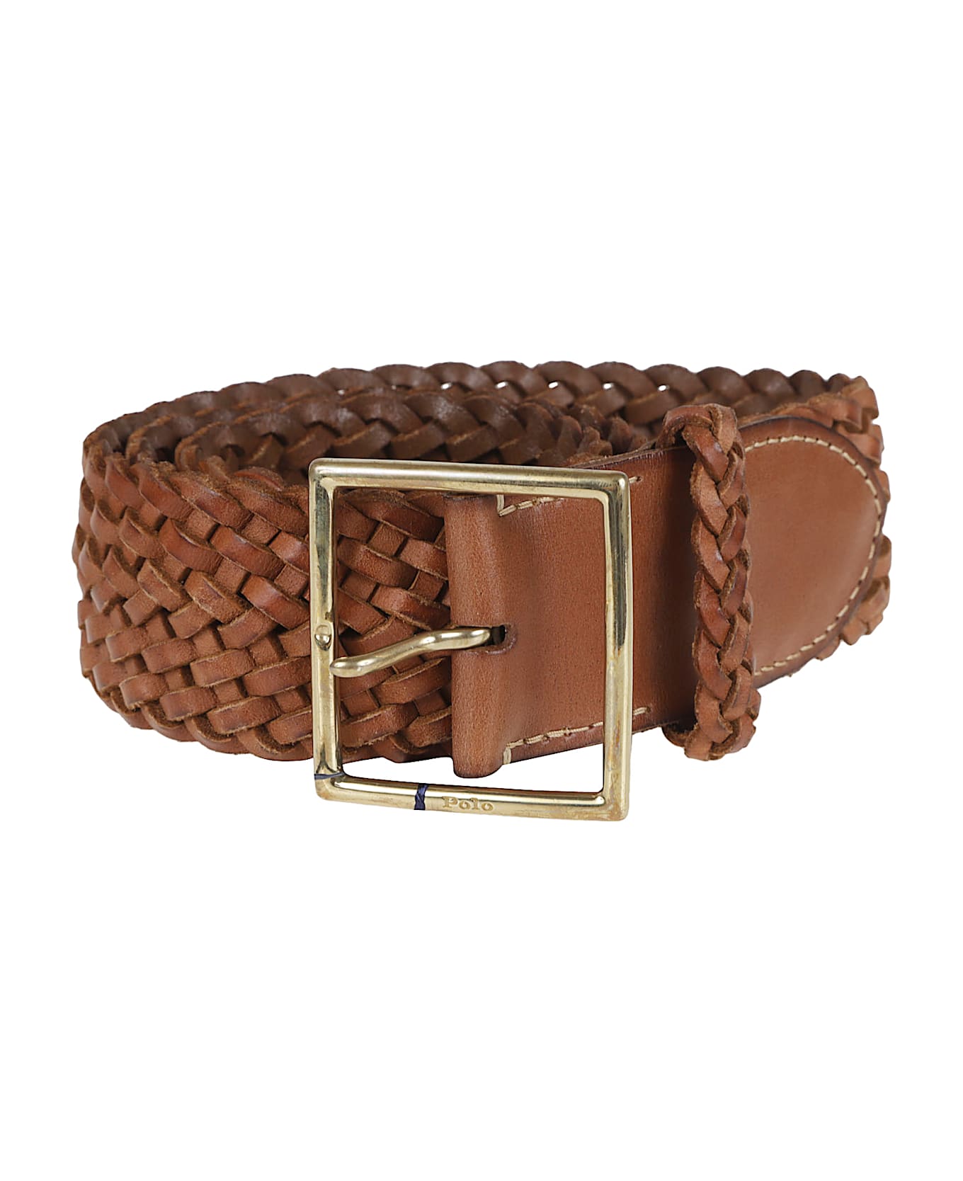 Soft woven leather belt by POLO RALPH LAUREN. Square metal buckle featuring an exclusive engraved logo.