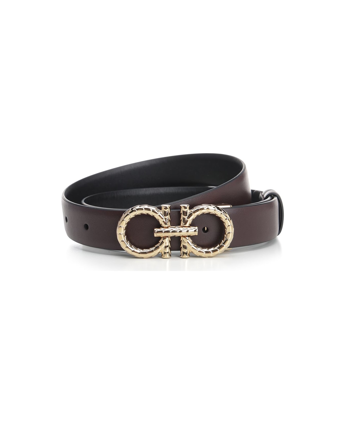 Reversible and adjustable Gancini belt in calfskin from Salvatore Ferragamo, with double Gancini buckle in gold finish, with snake scales workmanship Composition: Composition: 100% Calf