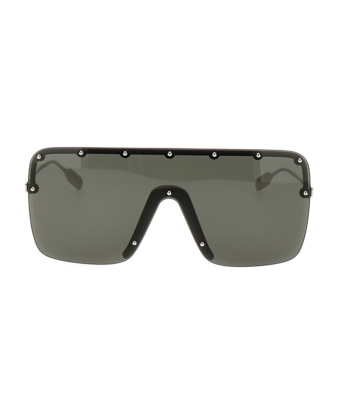 Sunglasses with shiny, yellow-gold metal mount with metal studs, shiny silver metal rods with overlapping GG logo, and dark gray solid color lenses. Total protection UVA/UVB. Composition: