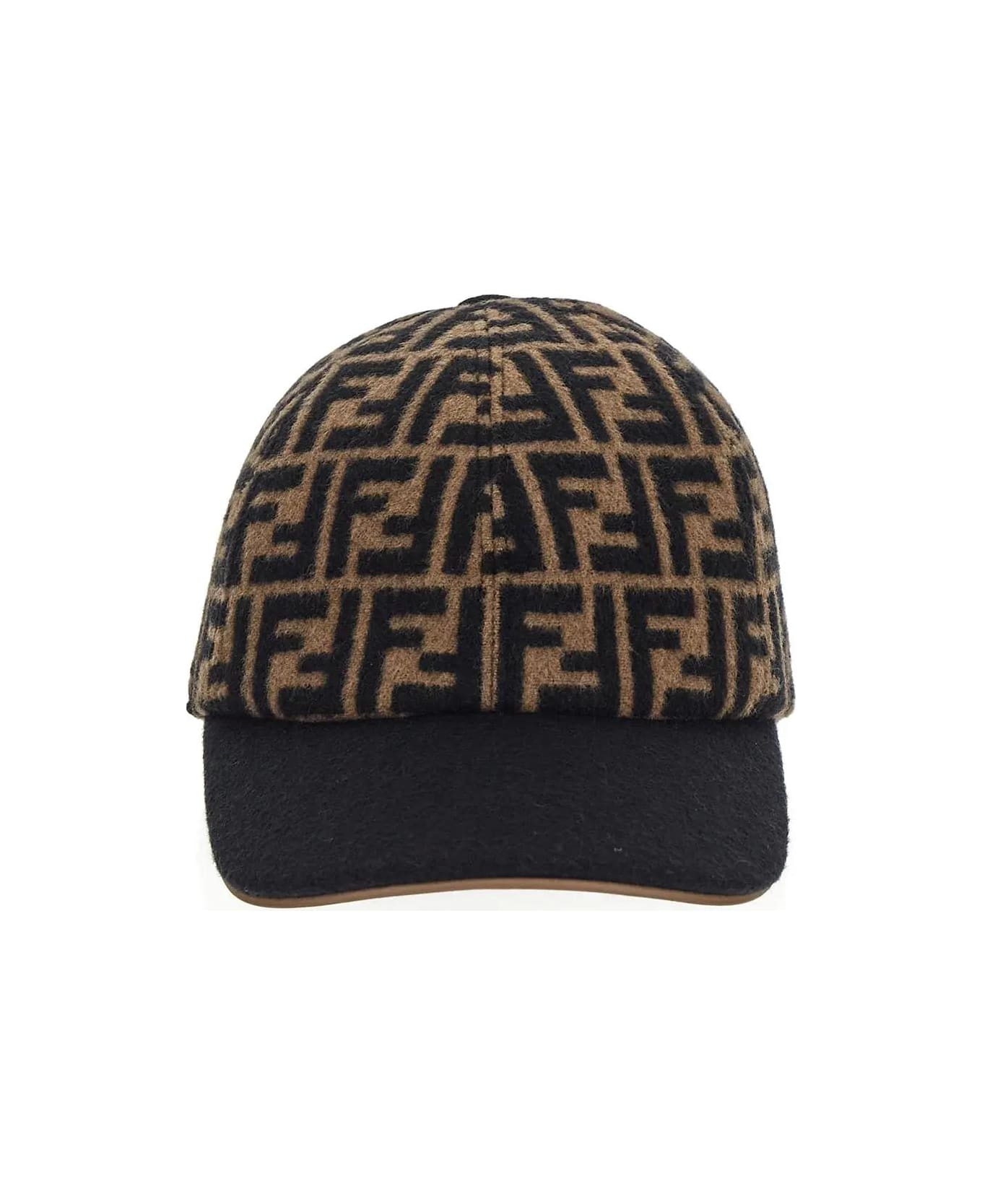 Fendi baseball cap in brown felted wool with black FF logo motif, black brim, brown leather brim edge and adjustment strap at back with gold -finish metallic buckle. Composition: 100% Wool