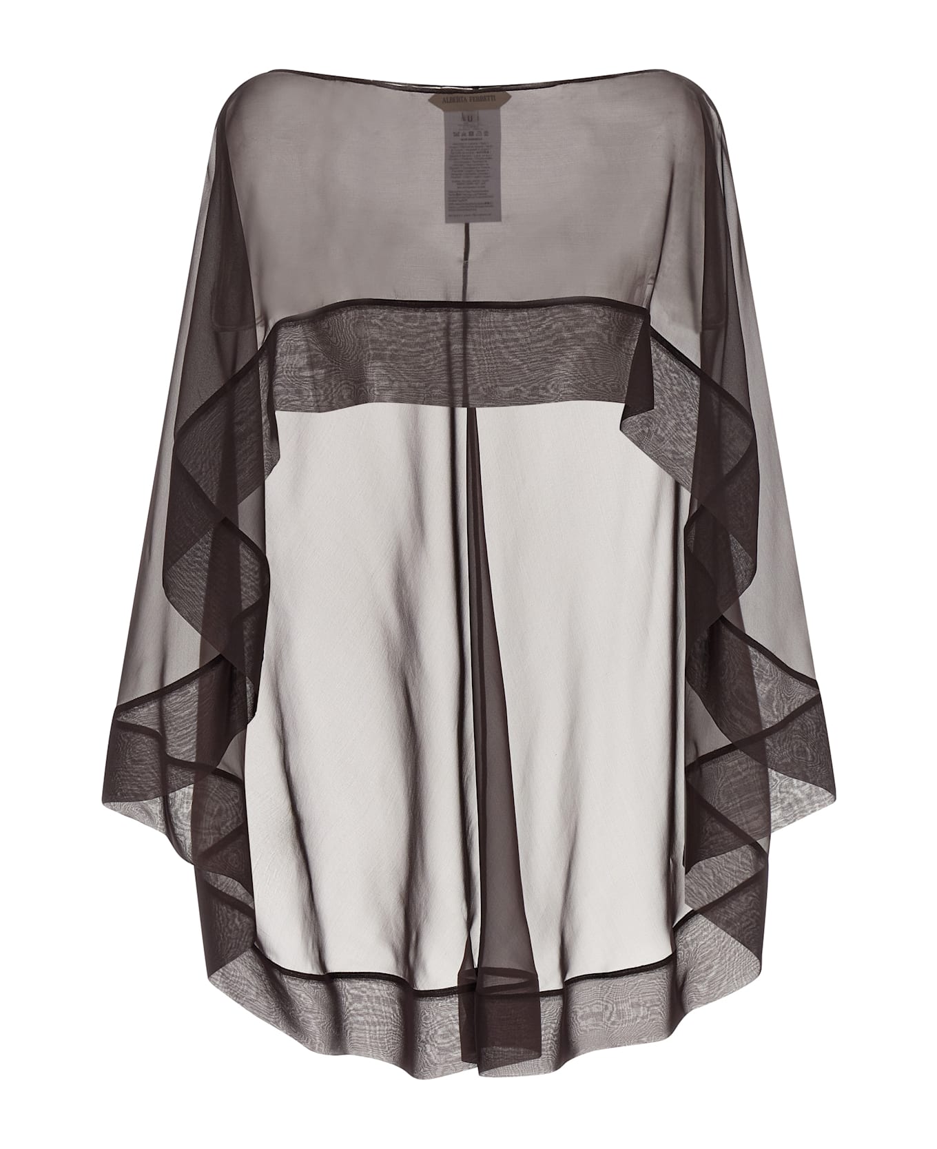 Semi-transparent silk chiffon scarf, hood style with boat neckline and asymmetric hem.