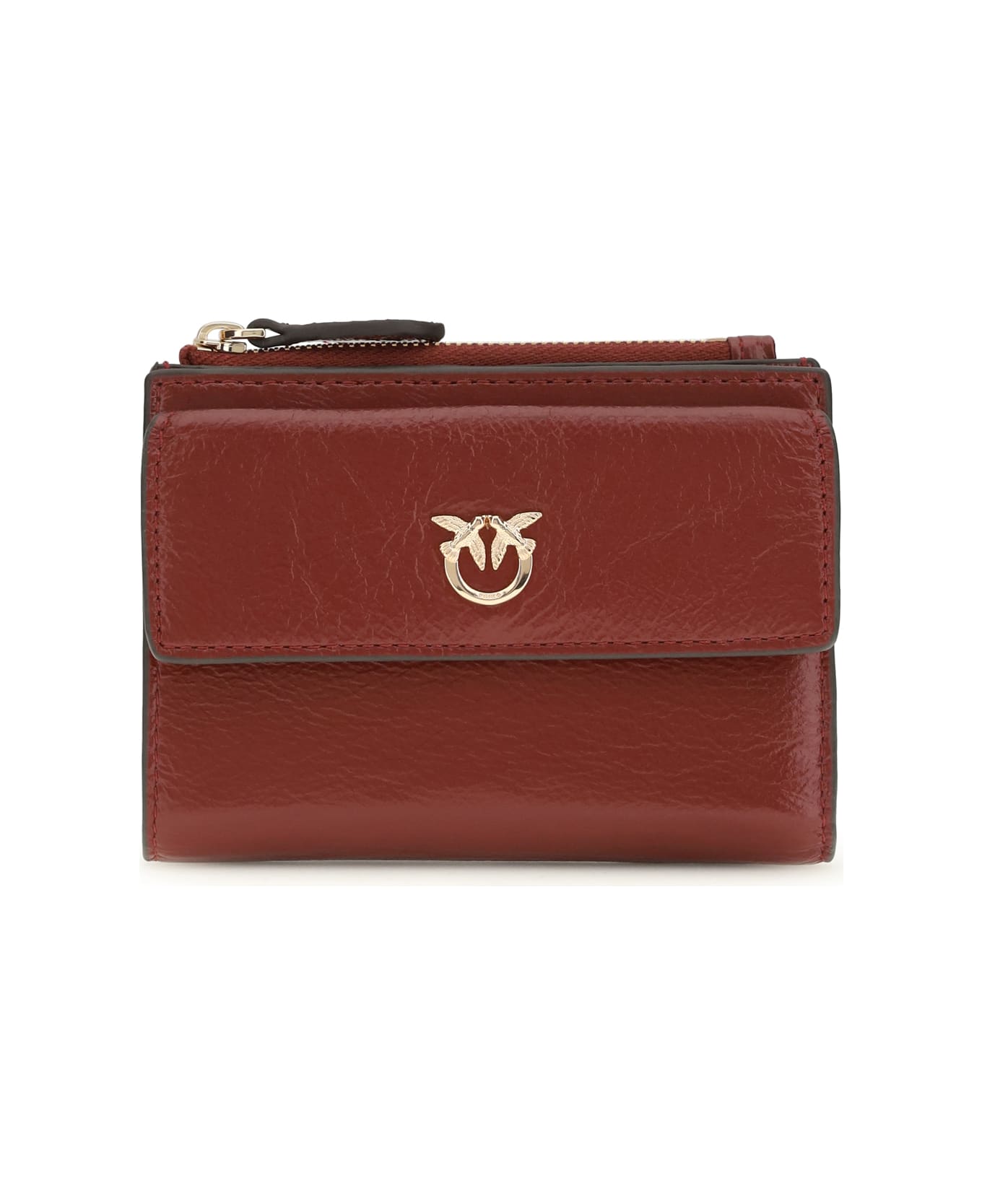The leather wallet by pinko, with logo on the front, is a practical and refined accessory. featuring a snap button closure, it offers a zippered pocket for coins and an organized interior with compartments for documents. perfect for those seeking style and functionality.