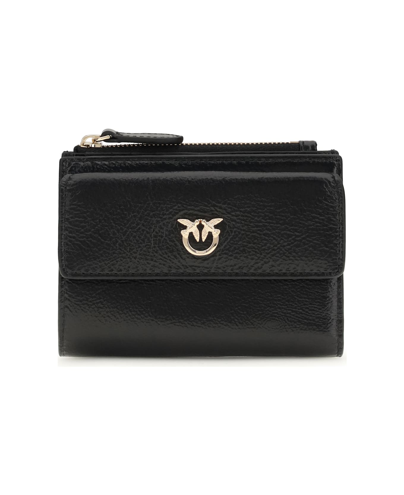 The leather wallet by pinko, with logo on the front, is a practical and refined accessory. featuring a snap button closure, it offers a zippered pocket for coins and an organized interior with compartments for documents. perfect for those seeking style and functionality.