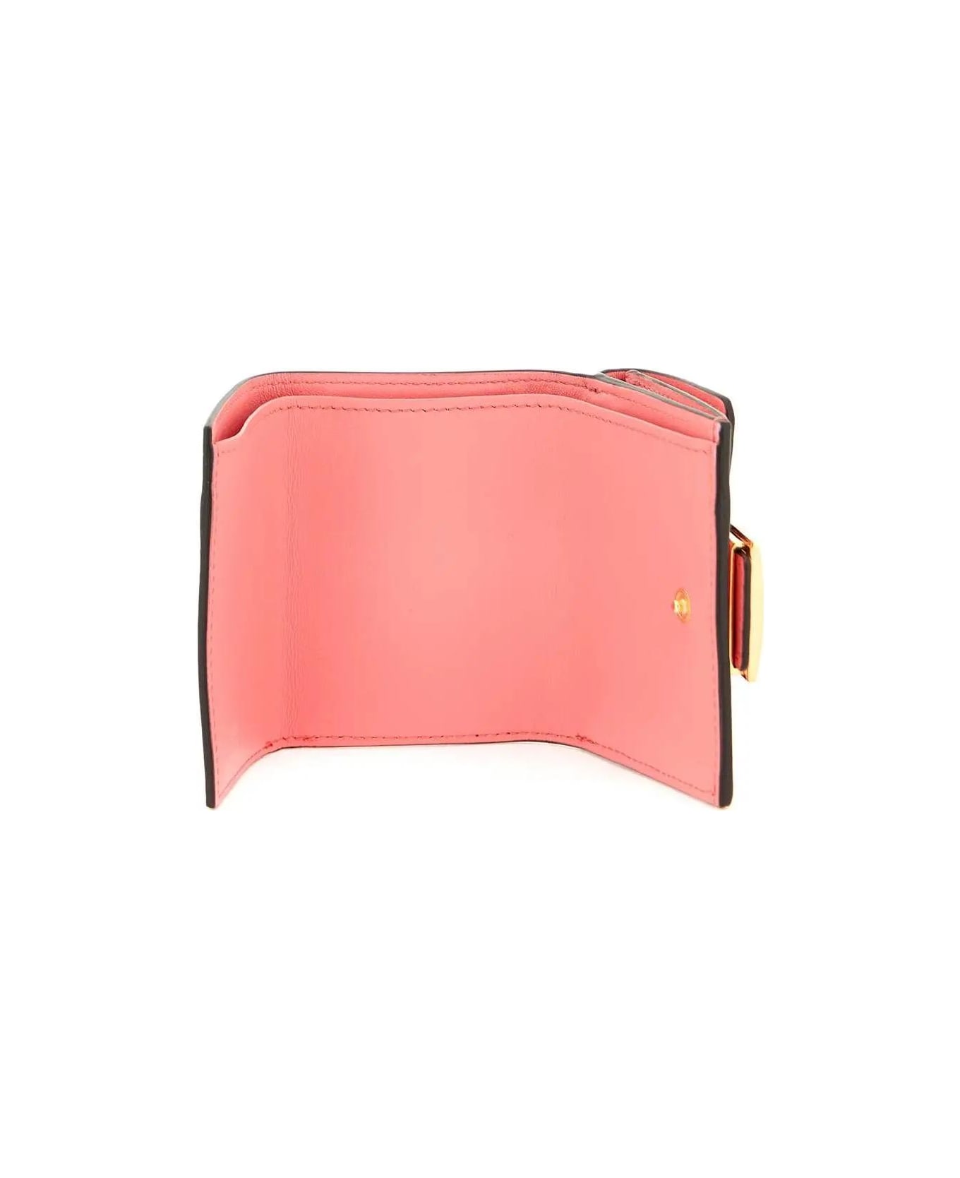 Fendi micro tri-fold wallet crafted in nappa leather and characterized by the front gusseted pocket featuring embossed FF motif and flap with press-stud closure and the iconic FF Baguette metal buckle. Press-stud closure, a flat banknote compartment and three credit card slots. Gold-finished metalware. Composition: 100% Lamb