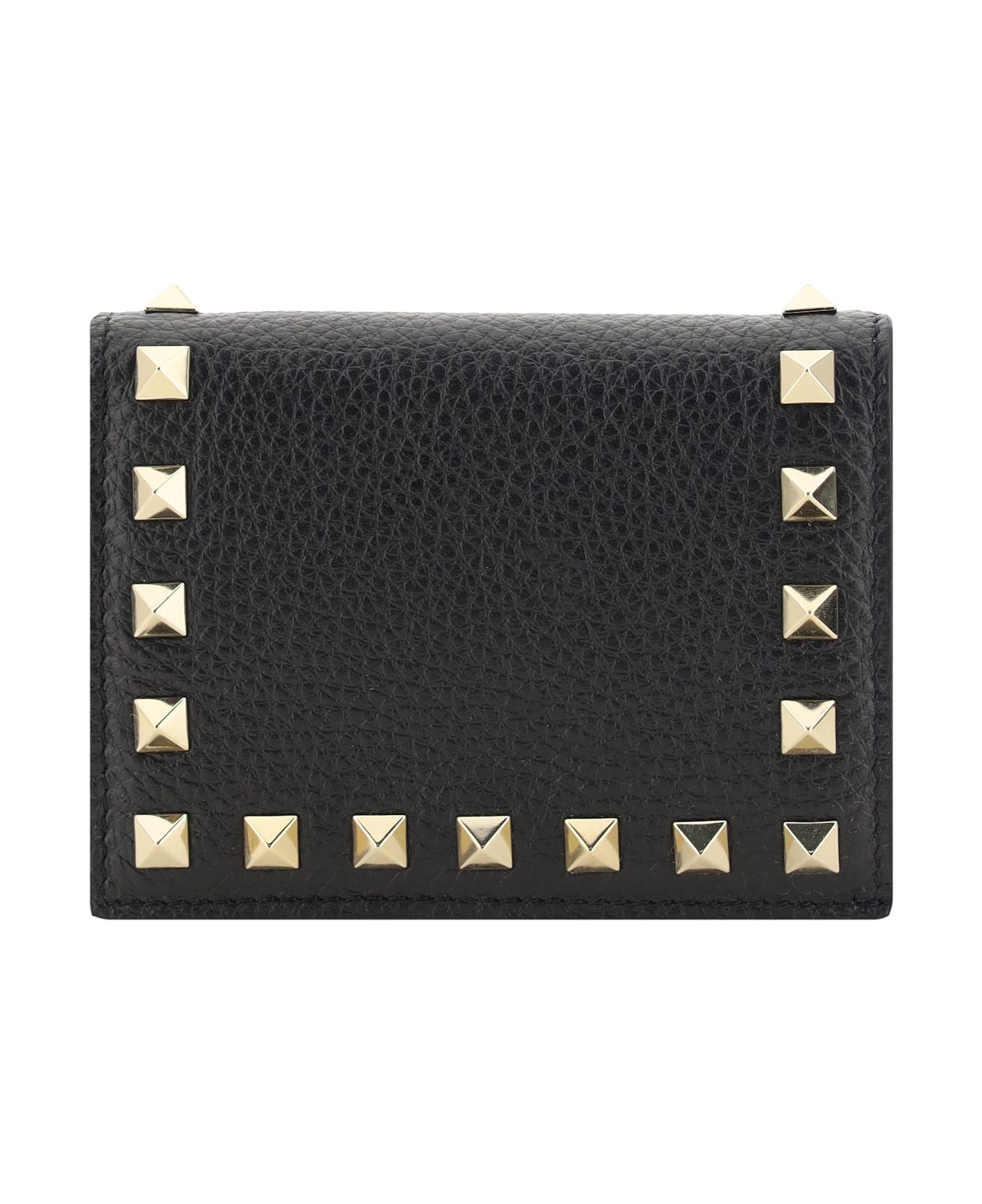 Calfskin rockstud french wallet by valentino garavani, grained leather design, iconic applied studs on beading, contrasting brand monogram printed on back, interior card slot, billfold design with snap button closure. Composition: 100% % Calf Leather Bos Taurus