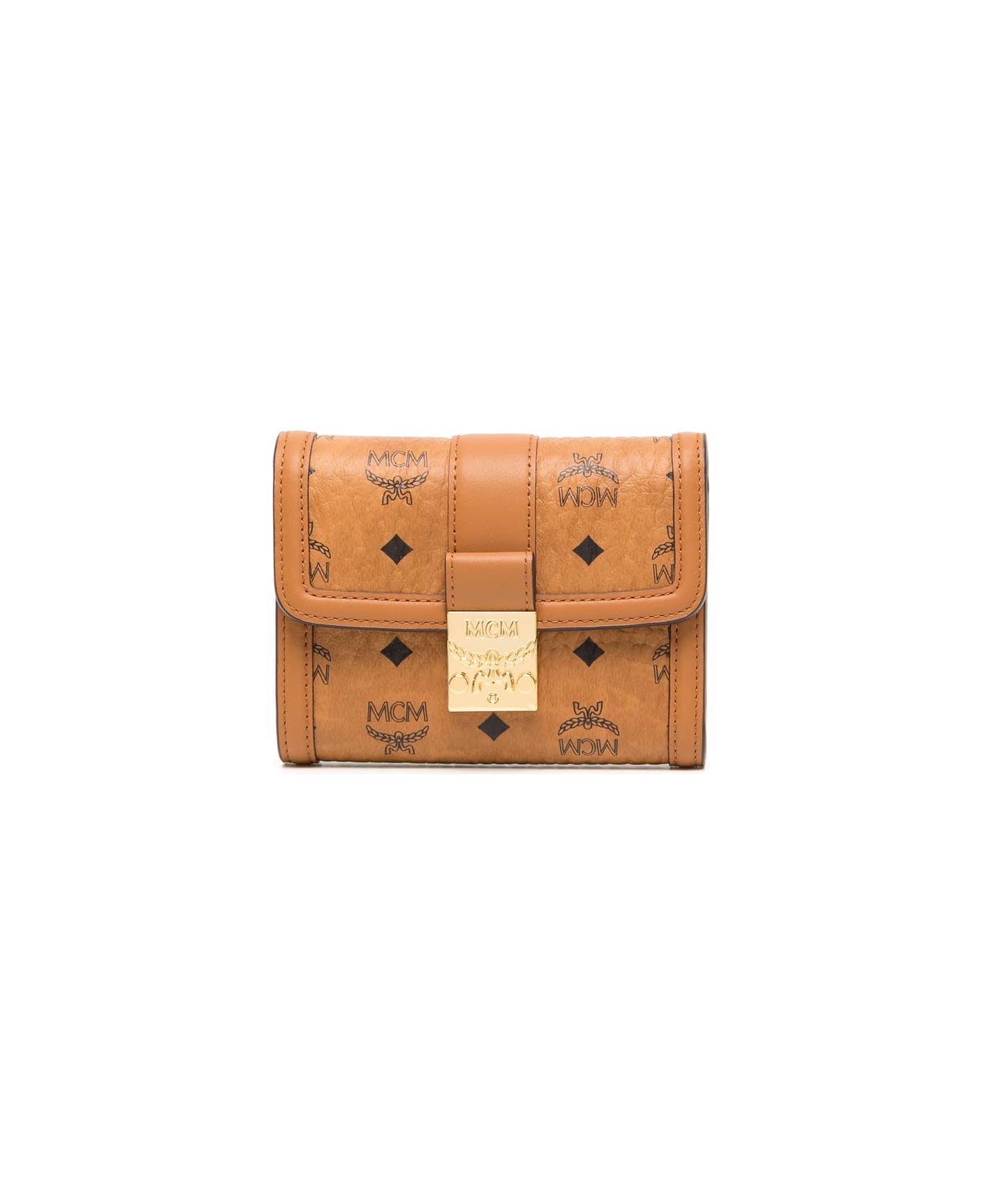 cognac brown/black canvas leather trim signature Visetos print 24kt gold plated gold-tone hardware gold-tone logo plaque tri-fold design press-stud fastening internal zip-fastening pocket internal card slots internal note compartments
