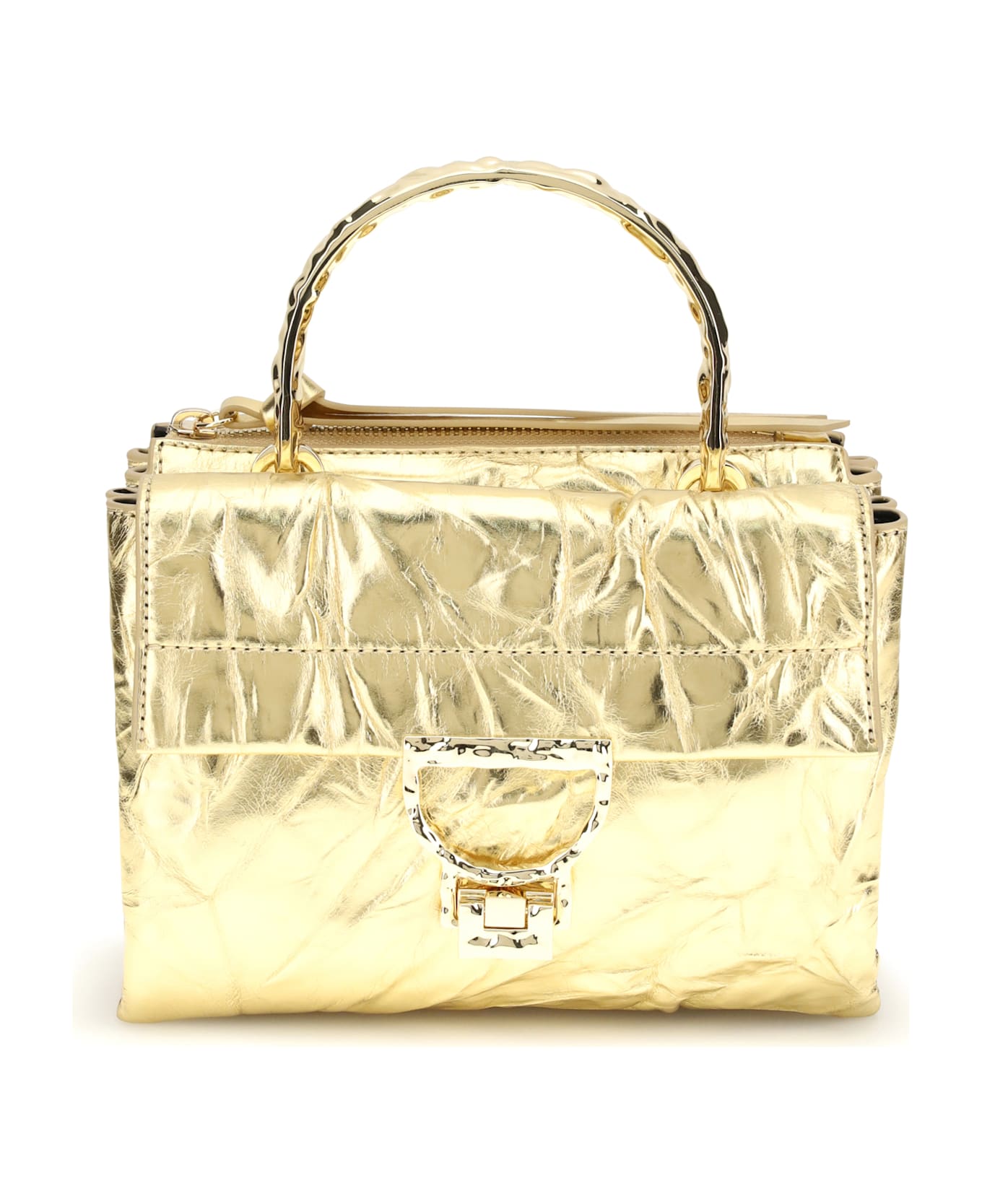 The arlettis droplet handbag by coccinelle, made of smooth laminated leather, offers hand and shoulder carryability thanks to its droplet-effect metal handle and adjustable, removable leather shoulder strap. the model features a flap closure, exterior zipper pocket and two interior compartments, combining elegance and functionality in a versatile and refined design.