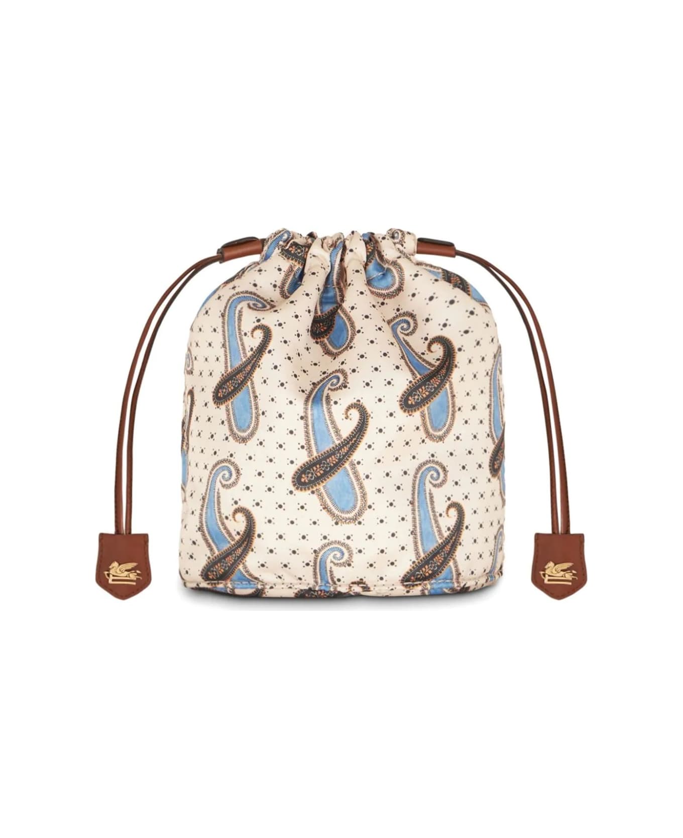 Etro pouch made of fabric decorated with Paisley patterns and micro polka dots and featuring brown leather drawstring with Etro and Pegasus logo. The Pouch can be used as a hand bag. Metallic accessories with light gold finish. Composition: Exterior:, 100% Polyester. Details:, 100% Calf Leather. Lining:, 100% Polyester.