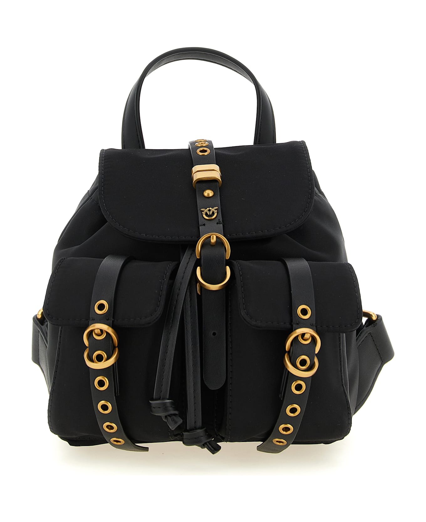 Nylon mini backpack, flap closure with leather-effect fabric strap with metal details and front 'Love Birds Diamond Cut' logo, inner drawstring, two front pockets, fixed top handle, adjustable ribbon shoulder straps, cotton drill lining.