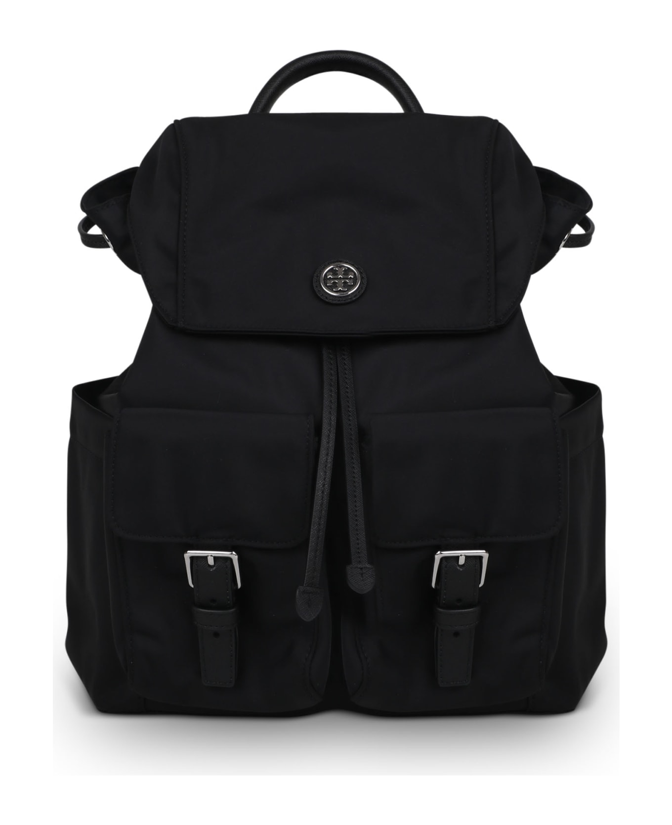 Recycled nylon flap backpack from TORY BURCHLeather finishes. Double T plaque. Drawstring closure. Main compartment. Inside pocket with zip. Two front pouch pockets. Round handle. Adjustable shoulder straps. 100% Recycled Nylon. Made in Cambodia.