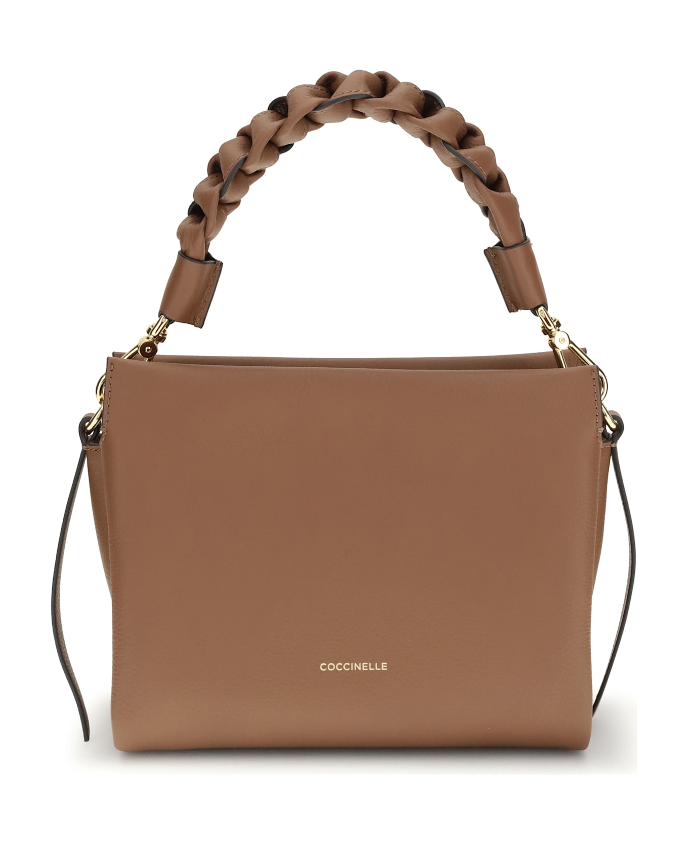 The boheme handbag by coccinelle is an elegant and sophisticated accessory made of high-quality garnet leather. the rigid leather top handle, with a braided and twisted detail, adds a handcrafted and distinctive touch. the removable and adjustable flat shoulder strap allows it to be worn on the shoulder or crossbody for added versatility. the top zipper closure provides security, while the brand's iconic monogram, press-stamped on the front, lends a touch of recognition.