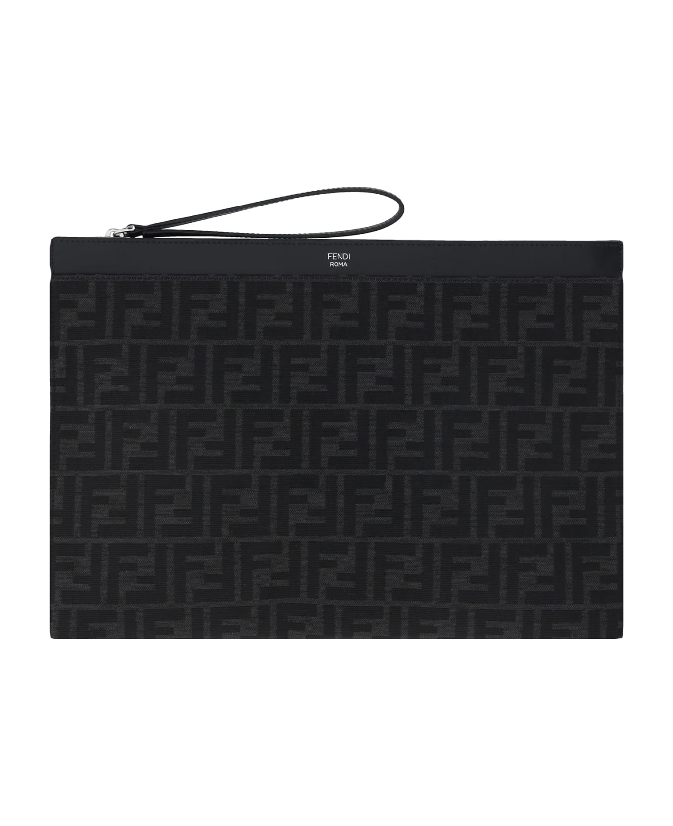 Beauty case by fendi, jacquard design with iconic all-over contrasting repeated brand ff logo, iconic brand monogram pressure-stamped on the front, top zipper closure, applied pull at the slider to carry it by hand.