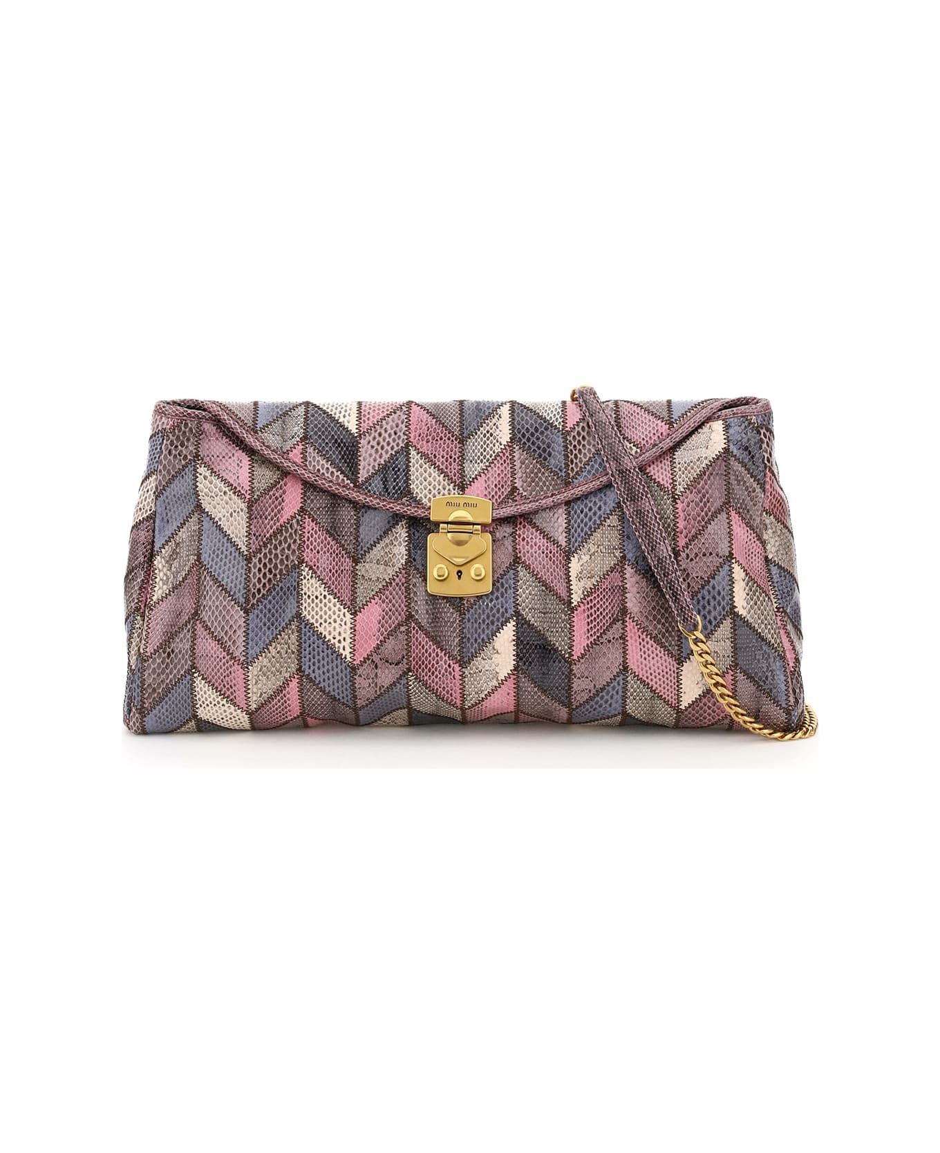 Large Miu Miu clutch bag in multicoloured ayers featuring all-over patchwork stitching and a flap with the iconic metal Confidential Lock snap closure. Removable chain shoulder strap with leather insert and metal logo patch on the back. The interior is lined in satin with a zip pocket, the accessories are in gold finish metal. Composition: 100% ayers