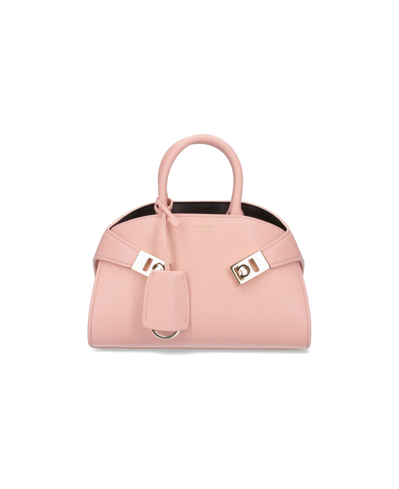 Ferragamo two-tone Hug mini handbag, pink calfskin leather, two handles, removable key ring detail, adjustable and removable shoulder strap, swivel strap closure, gold metal Gancini logo buckle detail, gold embossed logo on front, black lining, two interior card slots, one interior single compartment, metal feet on bottom.