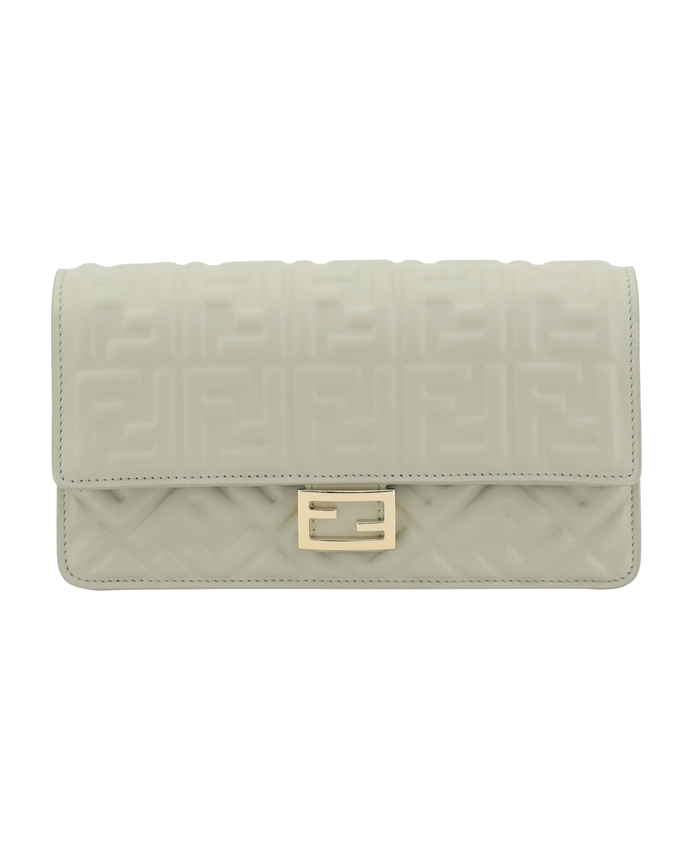 The matisse chain wallet by fendi is an elegant and practical accessory. made of leather, it features a gold chain for carrying it by hand, adding a touch of luxury. the front closure is with magnetic flap, while the three-dimensional plaque with the brand's iconic ff logo is a distinctive detail. the padded design, with the all-over embossed repeated logo, gives a sophisticated and modern look, perfect for those seeking elegance and functionality.